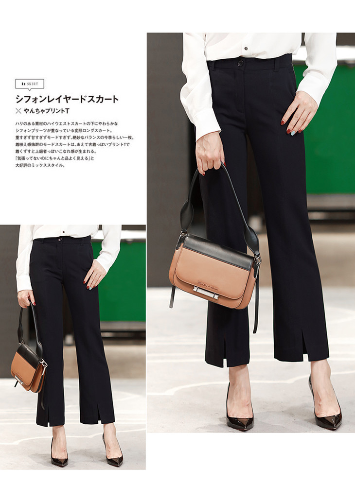下摆开叉型喇叭裤搭配简单的白衬衫,日常通勤帅呆啦,再冷一些,可以搭配西装外套,或者长款风衣,下摆开叉的设计,zui好的搭配是高跟鞋,露出脚背视觉上更显腿长,如果不习惯穿高跟鞋的可以试着搭配乐福鞋或者平底的单鞋都是不错的选择。