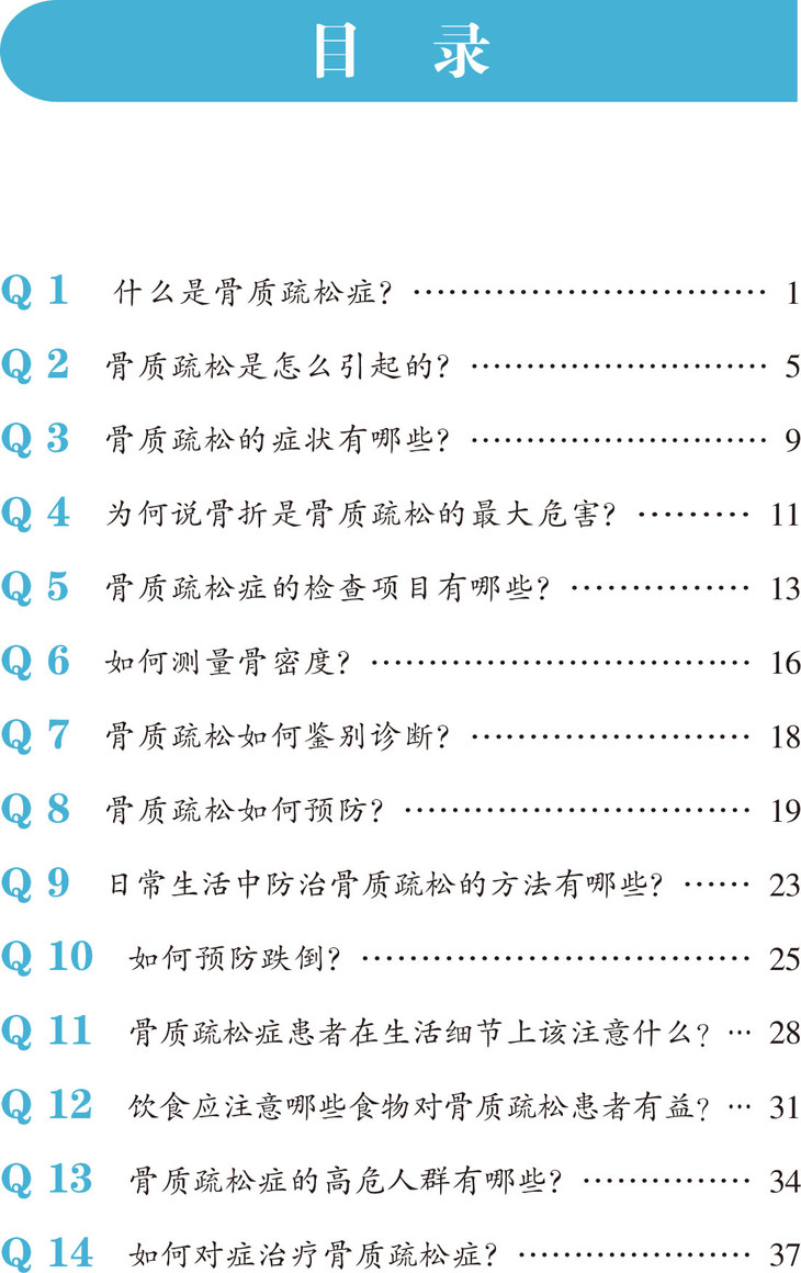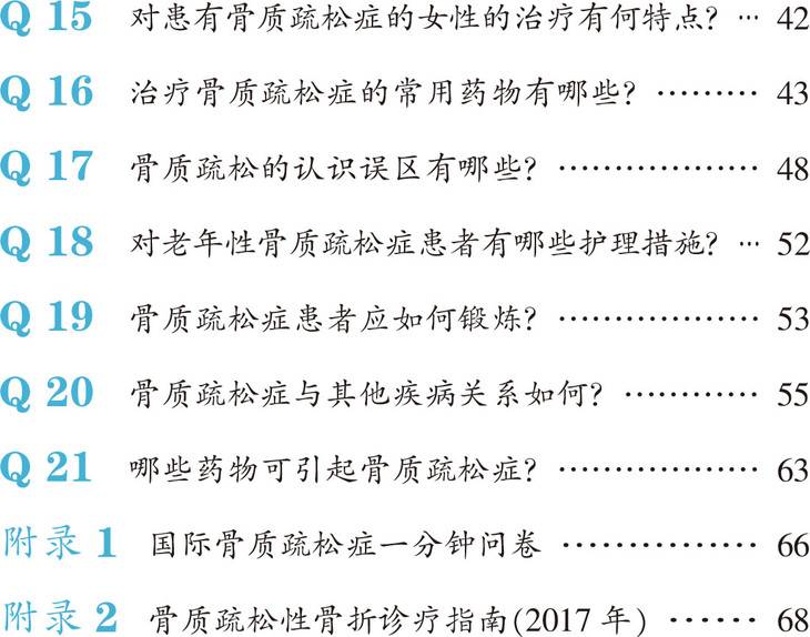 本书以问答的形式,针对骨质疏松的基本知识,对其在诊断、治疗及康复方面的疑问进行解答。内容包括:什么是骨质疏松症、骨质疏松是怎么引起的、骨质疏松症的症状、骨质疏松症的检查项目、如何测量骨密度、骨质疏松症如何鉴别诊断、骨质疏松症如何预防、日常生活中骨质疏松的防治方法、如何防止跌倒、哪些食物对骨质疏松症有益、骨质疏松症的高危人群、如何对症治疗骨质疏松症、女性骨质疏松症治疗、骨质疏松症的常用药物、骨质疏松症的认识误区、老年性骨质疏松症护理措施,以及骨质疏松症与其他疾病的关系。旨在帮助患者和家属更科学地了解疾病、有效地对此类疾病进行预防和康复。