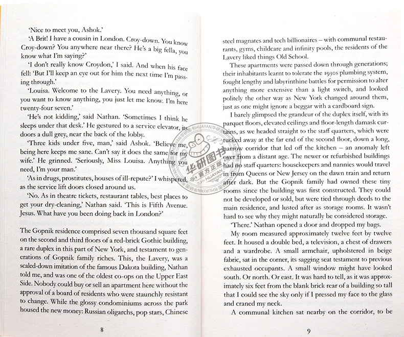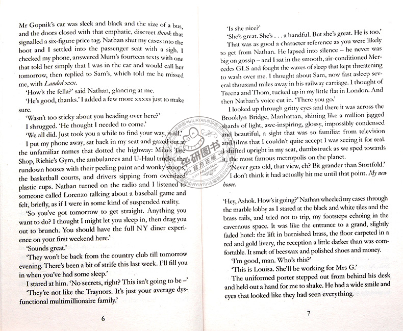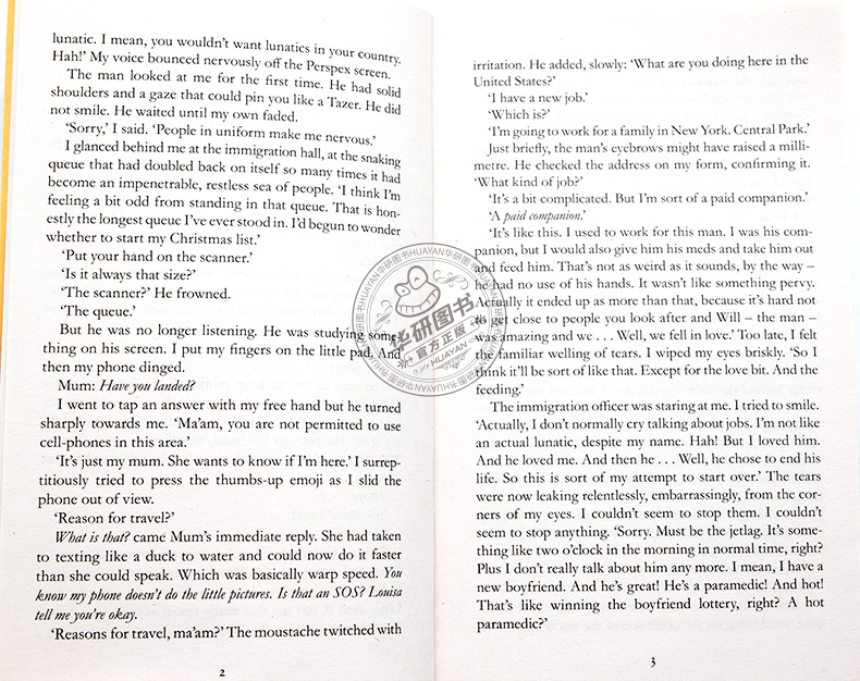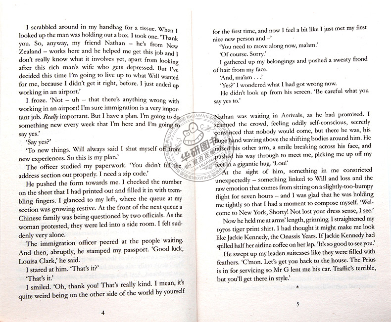 It was the mustache that reminded me I was no longer in England: a solid, gray millipede firmly obscuring the man’s upper lip; a Village People mustache, a cowboy mustache, the miniature head of a broom that meant business. You just didn’t get that kind of mustache at home. I couldn’t tear my eyes from it. “Ma’am?” The only person I had ever seen with a mustache like that at home was Mr. Naylor, our maths teacher, and he collected Digestive crumbs in his—we used to count them during algebra. “Ma’am?” “Oh. Sorry.” The man in the uniform motioned me forward with a flick of his stubby finger. He did not look up from his screen. I waited at the booth, long-haul sweat drying gently into my shirt. He held up his hand, waggling four fat fingers. This, I grasped after several seconds, was a demand for my passport. “Name.” “It’s there,” I said. “Your name,ma’am.” “Louisa Elizabeth Clark.” I peered over the counter. “Though I never use the Elizabeth bit. Because my mum realized after they named me that that would make me Lou Lizzy. And if you say that really fast it sounds like lunacy. Though my dad says that’s kind of fitting. Not that I’m a lunatic. I mean, you wouldn’t want lunatics in your country. Hah!” My voice bounced nervously off the Plexiglas screen. The man looked at me for the first time. He had solid shoulders and a gaze that could pin you like a Tazer. He did not smile. He waited until my own faded. “Sorry,” I said. “People in uniform make me nervous.” I glanced behind me at the immigration hall, at the snaking queue that had doubled back on itself so many times it had become an impenetrable, restless sea of people.