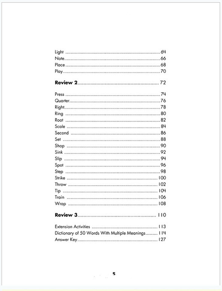 Act, Back, Band, Bank, Bark, Bat, Bill, Bit, Block, Break, Brush, Change, Charge, Check, Course, Cover,(Review 1), Cross, Date, Draw, Dust, Fair, Fan, File, Flat, Foot, Form, Grade, Jam, Light, Note, Place, Play,(Review 2), Press, Quarter, Right, Ring, Root, Scale, Second, Set, Shop, Sink, Slip, Spot, Step, Strike, Throw, Tip, Train, Wrap,(Review 3)