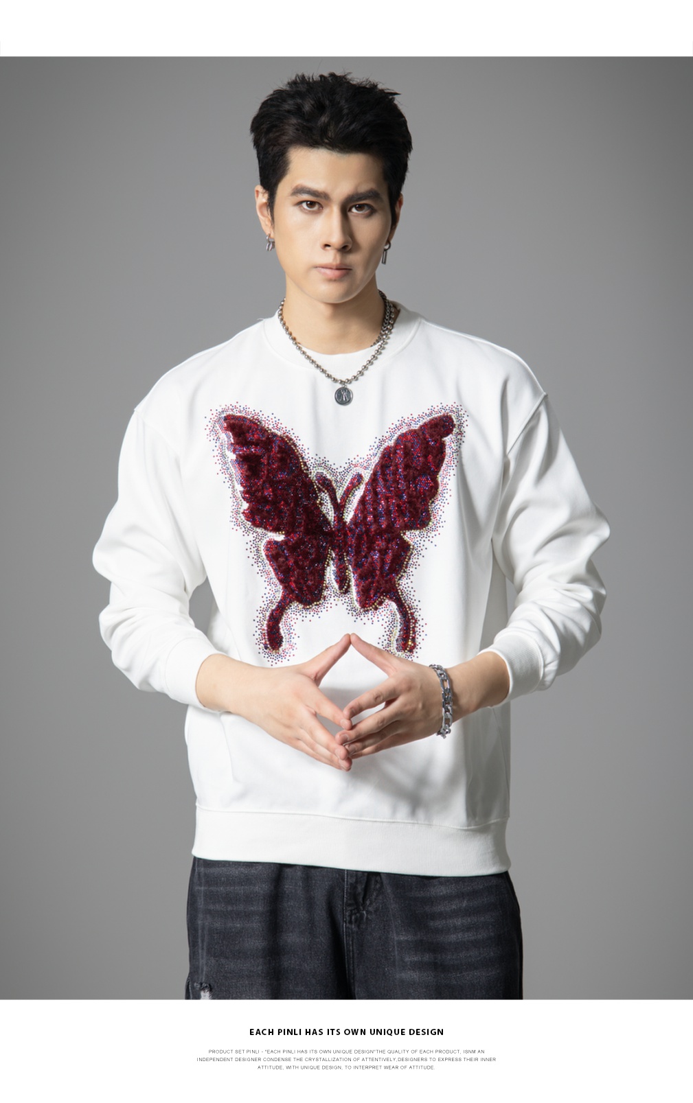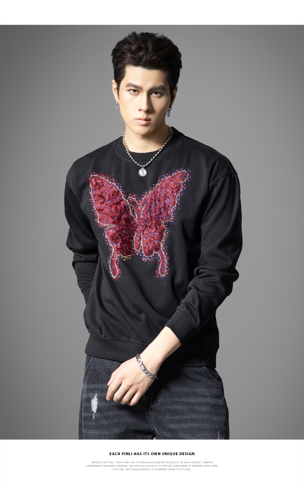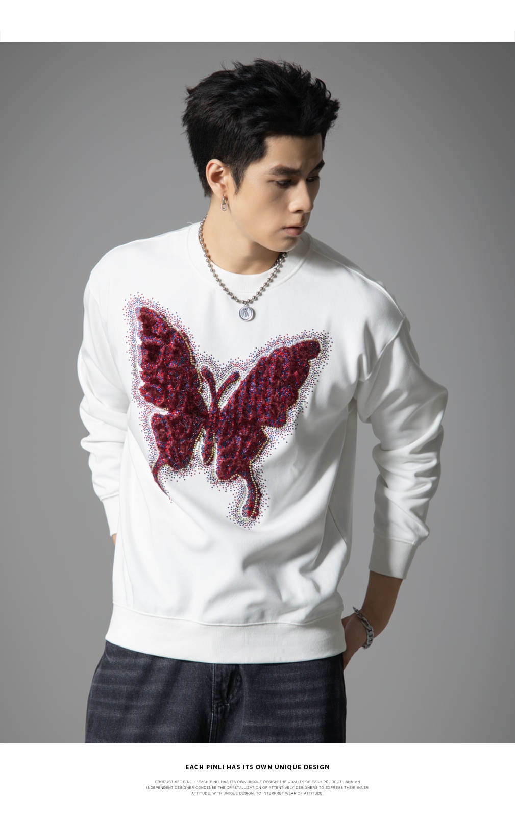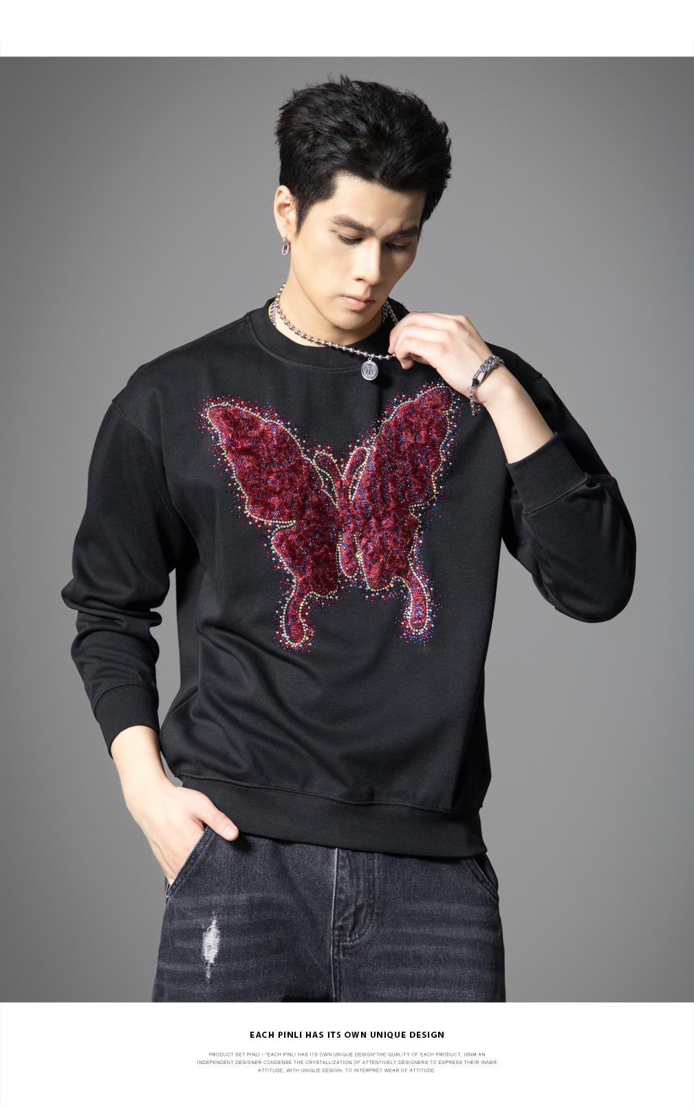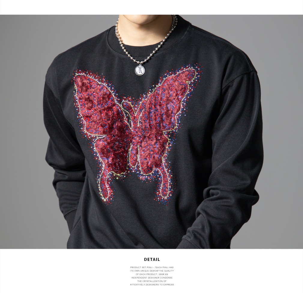 PINLI品立春季新款蝴蝶烫钻圆领卫衣美式潮牌宽松长袖男上衣BG251109002
