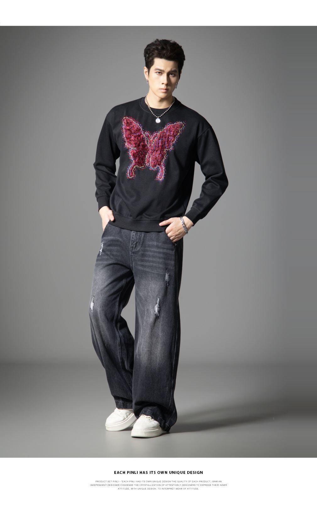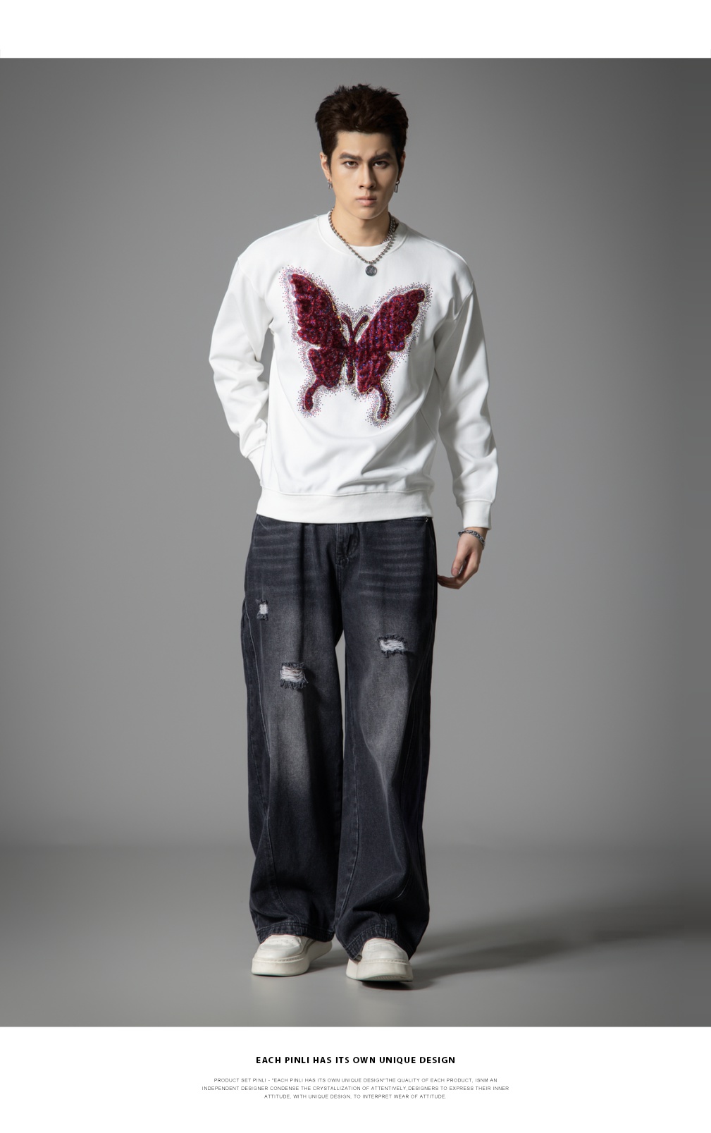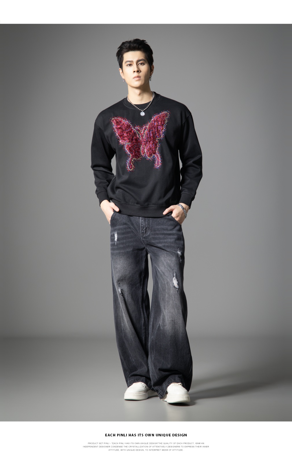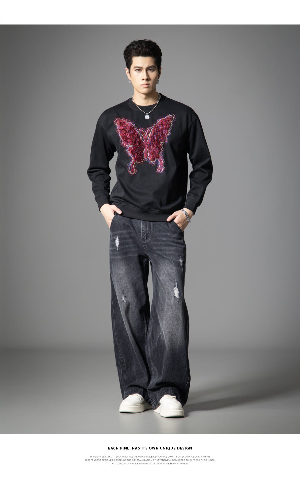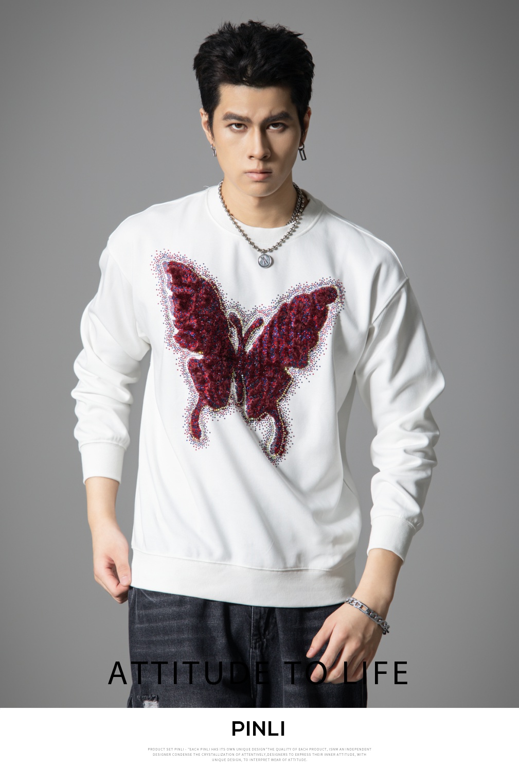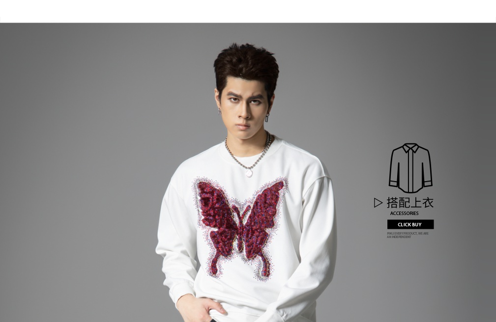 PINLI品立春季新款蝴蝶烫钻圆领卫衣美式潮牌宽松长袖男上衣BG251109002