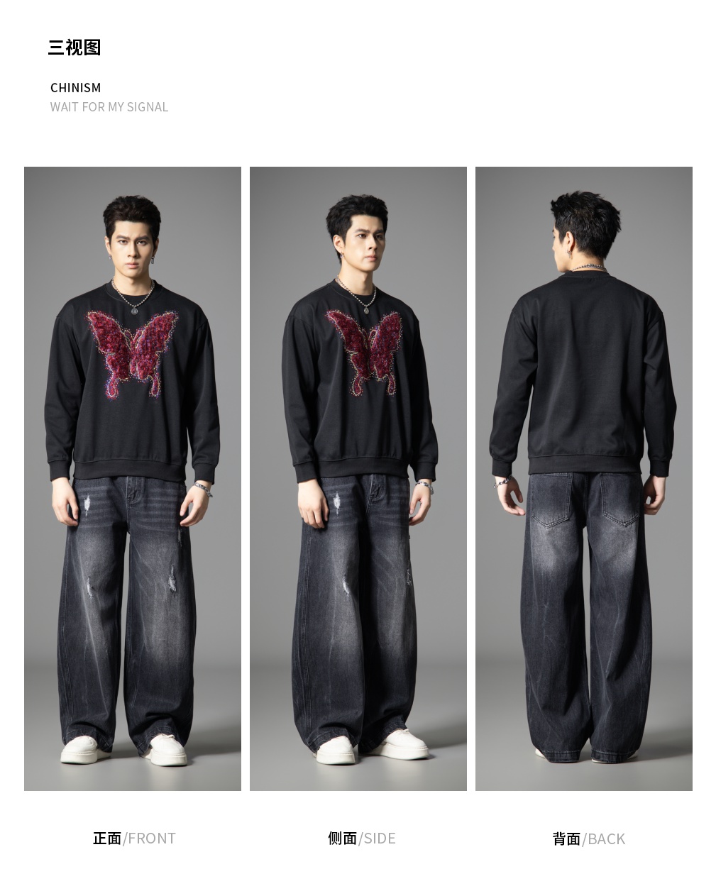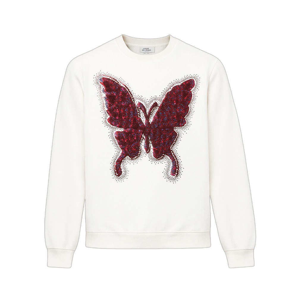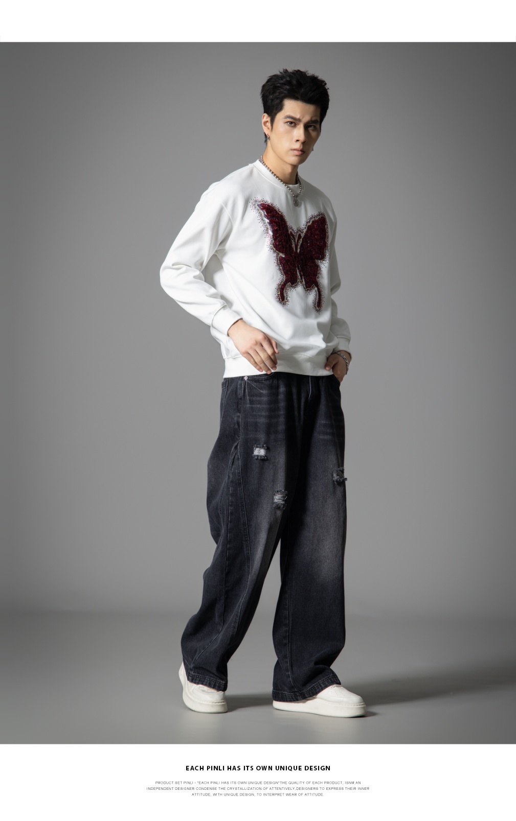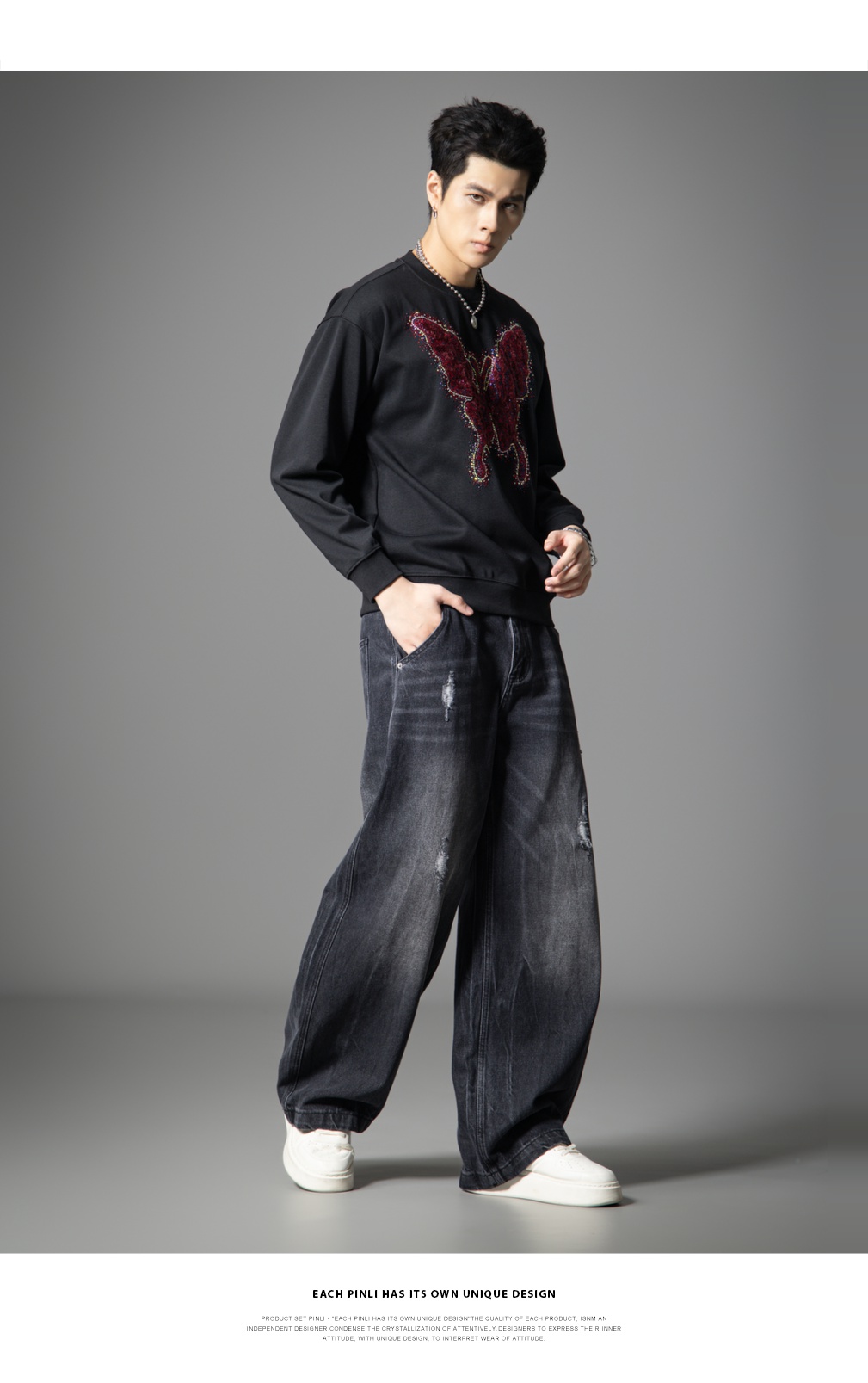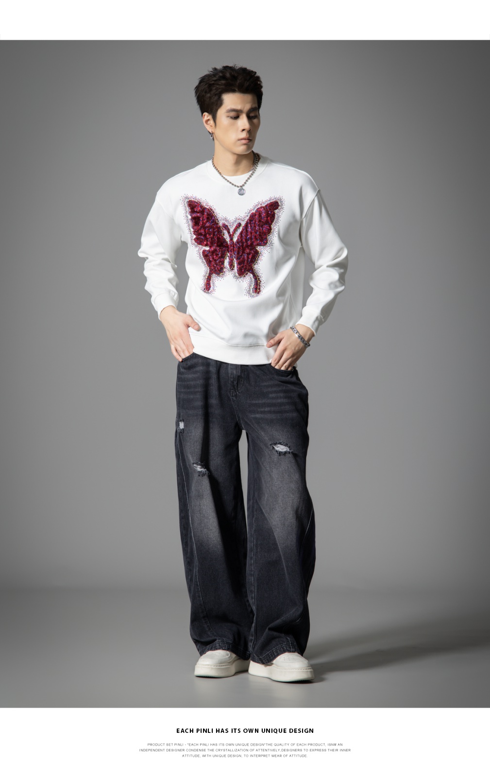 PINLI品立春季新款蝴蝶烫钻圆领卫衣美式潮牌宽松长袖男上衣BG251109002