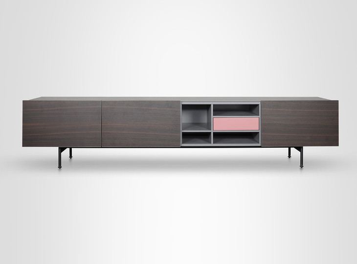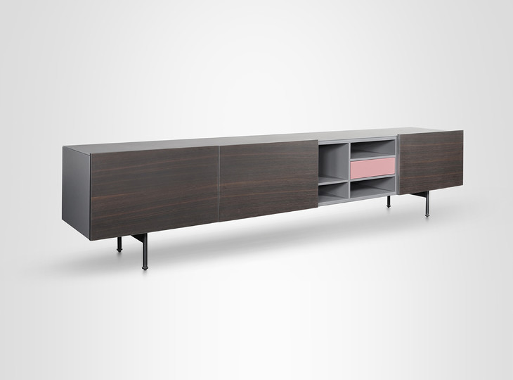 主材:磨砂灰玻璃台面+底架黑色烤漆+门板木皮
