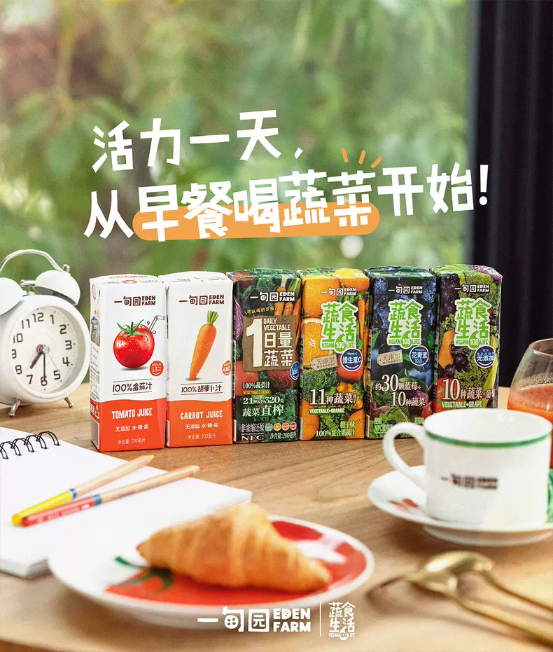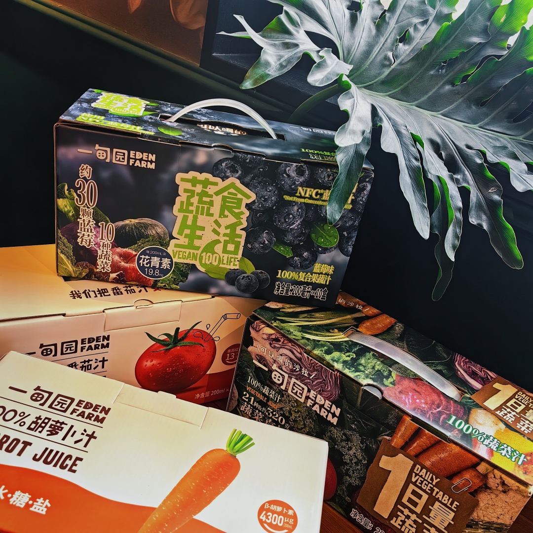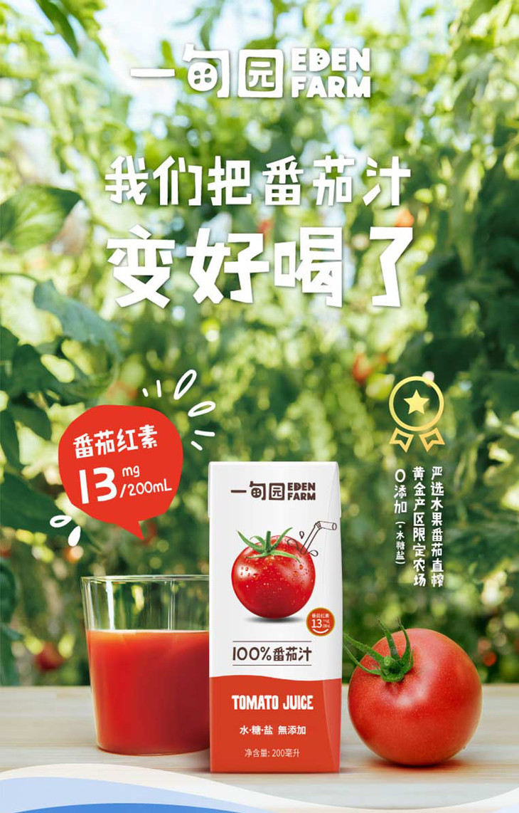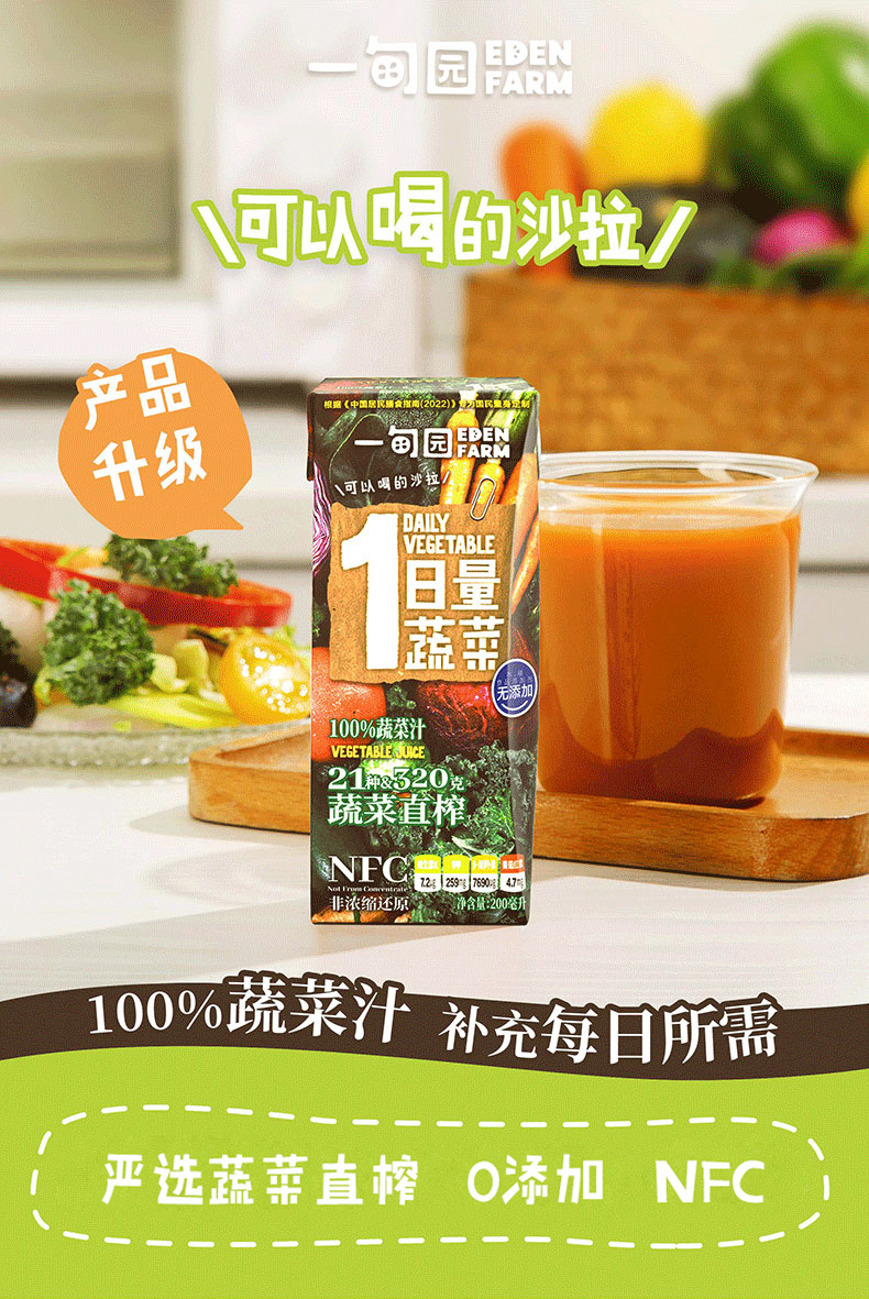 一甸园EdenFarm,2020年成立,一直探寻方便轻松的方式帮助解决中国居民膳食蔬菜摄入不足的问题,为消费者构建“蔬菜可以比你以为的更好喝,也比想象中更重要”的消费理念,从发布第一款“100%零添加、健康、美味”的番茄汁饮品开始,一直到现在的一日量蔬菜系列和蔬食生活系列,一直坚持100%无添加、非浓缩还原。