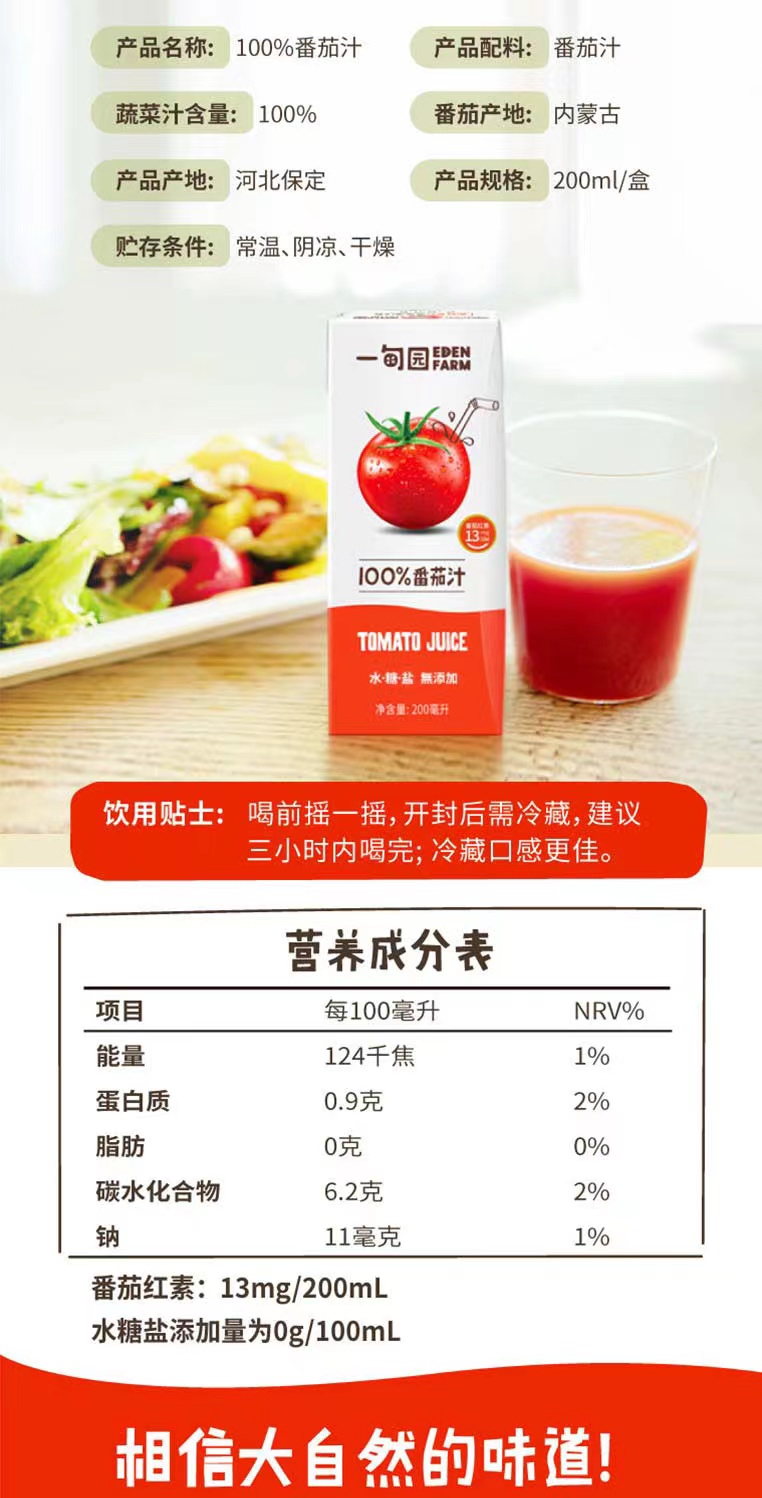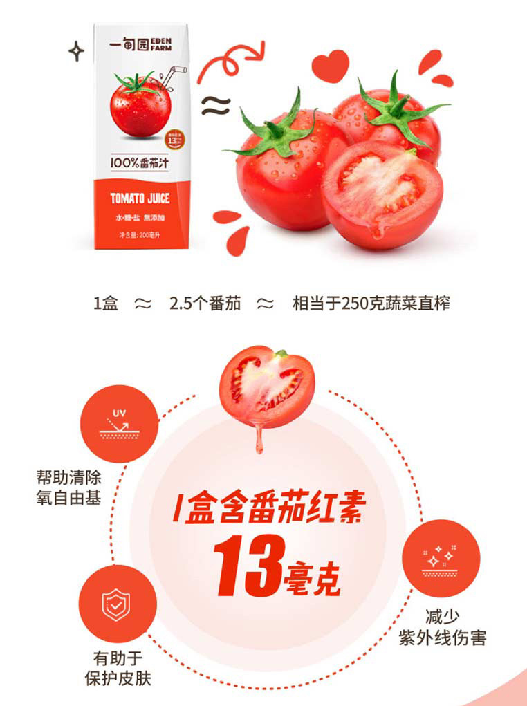 一甸园的番茄汁选用内蒙古水果番茄,黄金产区自然生长120天以上确保成熟度才摘取,一盒200ml,约由2.5个番茄直榨,没有一滴水,也不添加食盐保鲜或者加糖增加风味,口感很新鲜,是稠稠的那种哦!每瓶一甸园番茄汁含约13mg番茄红素,可以帮助抗氧化、提高皮肤对紫外线抵御能力、减少炎症提高身体免疫力,是需要多多摄入的营养成分!