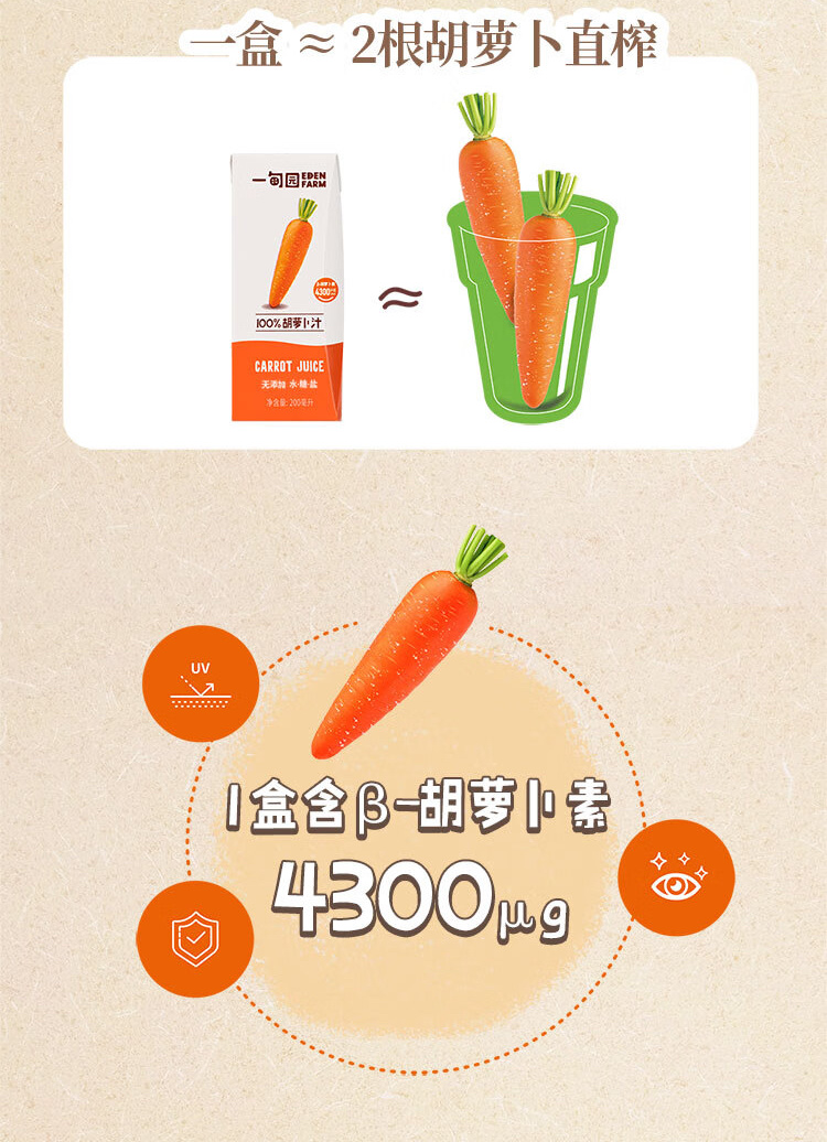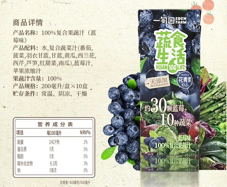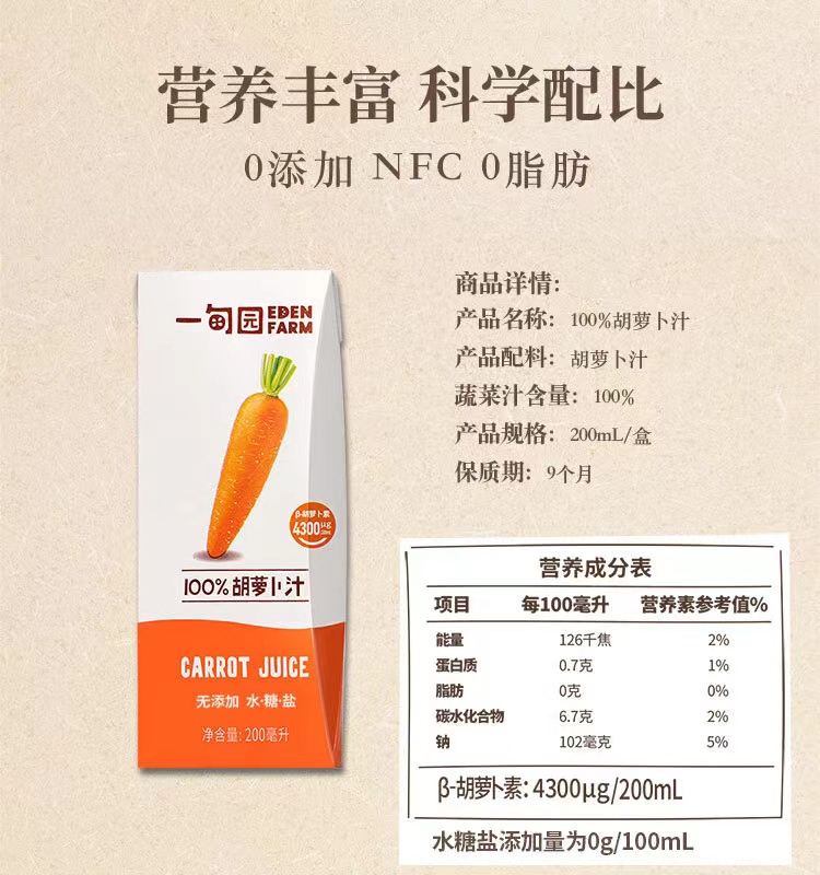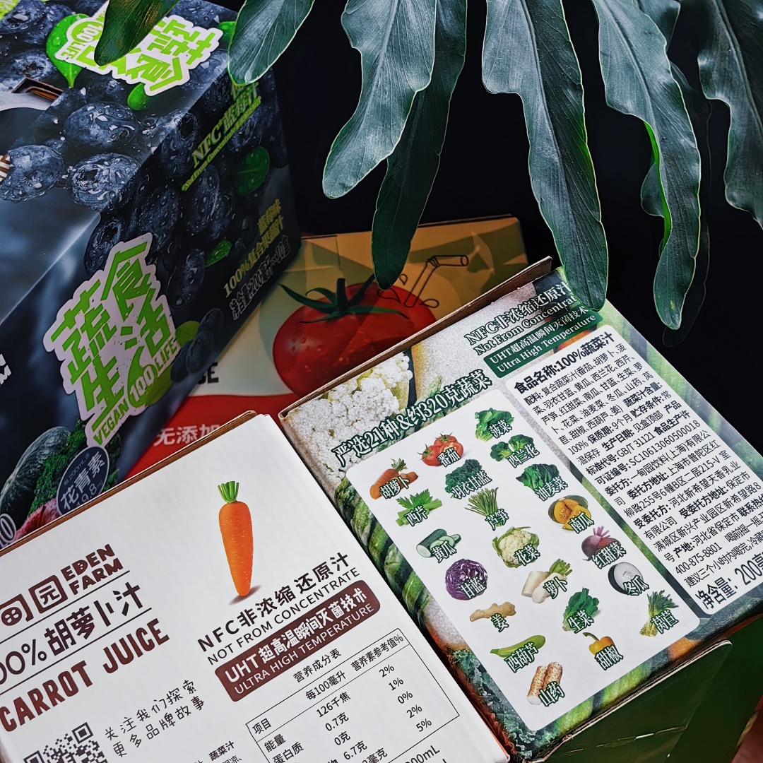 一甸园的每一瓶纯果蔬都是直榨的NFC原汁,配料表干净,不是浓缩液,也无添加水糖盐,还是0脂,UHT超高温瞬间灭菌技术令果蔬汁的风味、营养都得到很好的保存,利乐包装也确保了无需冷藏和防腐剂也能在一定时间内保质。