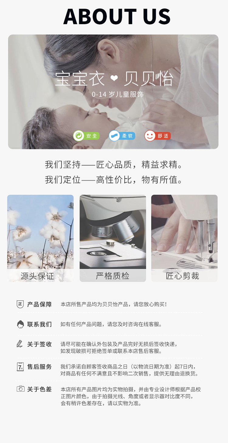- 贝贝怡专注0-6岁婴幼儿服饰,坚持安全、柔软、舒适的产品理念,为千万中国家庭提供超高品质、安全可靠的婴幼儿服饰产品,妈妈放心,宝宝开心!