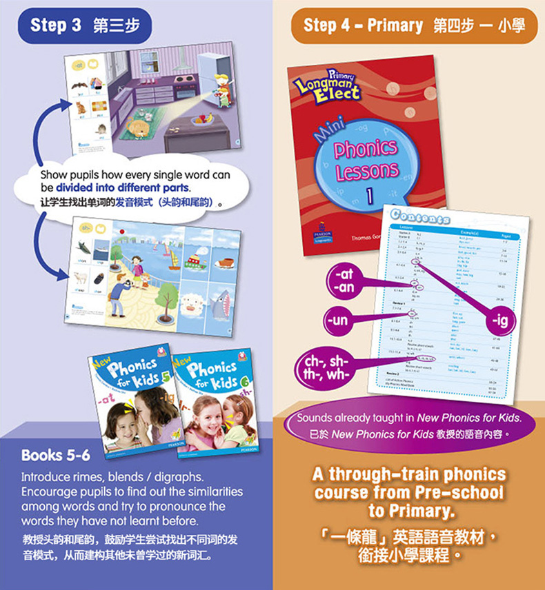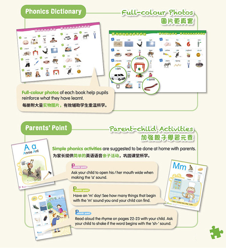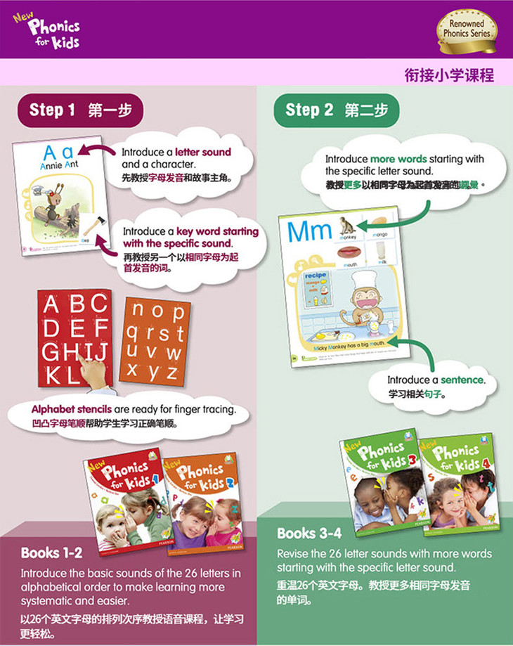 New Phonics for Kids是Phonics for Kids的修订版,全套书分为三级,共六册课本,是一套有系统的幼儿语音课程。每一课次教授一个语音项目,配合多种有趣的活动,帮助幼儿巩固所学。