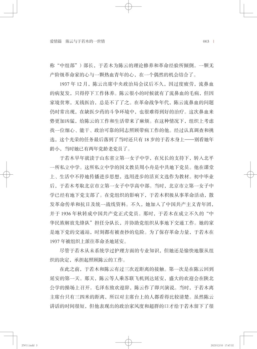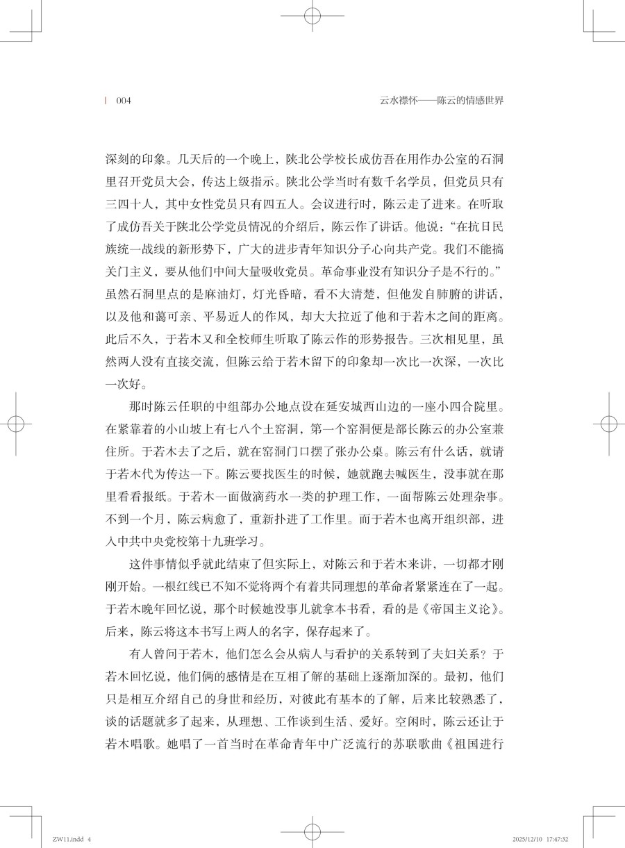 2025年是陈云诞辰120周年。本书兼具学术严谨性与生动可读性,在叙述角度上颇具新意:以;情感为切入点,主要分为爱情、亲情、友情、乡情和情趣五个部分展开叙述,语言自然晓畅,有助于拉近大众读者心理距离,也对丰富陈云生平研究、充实党的历史和理论研究起到积极作用。