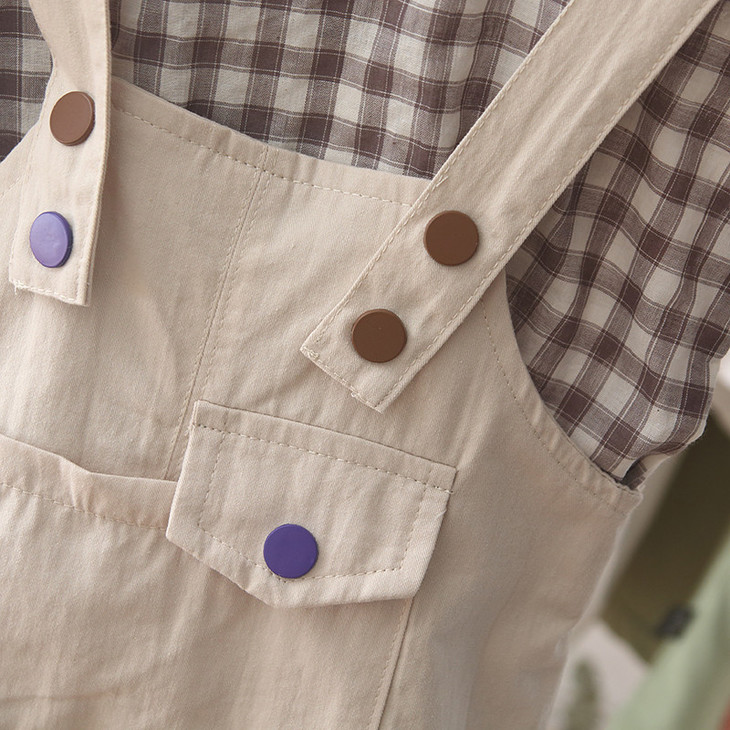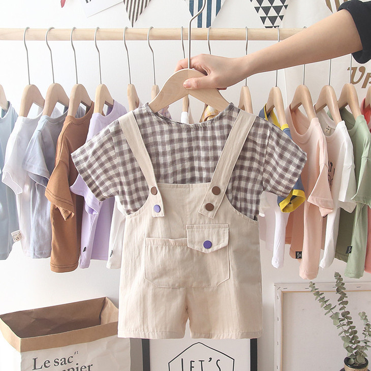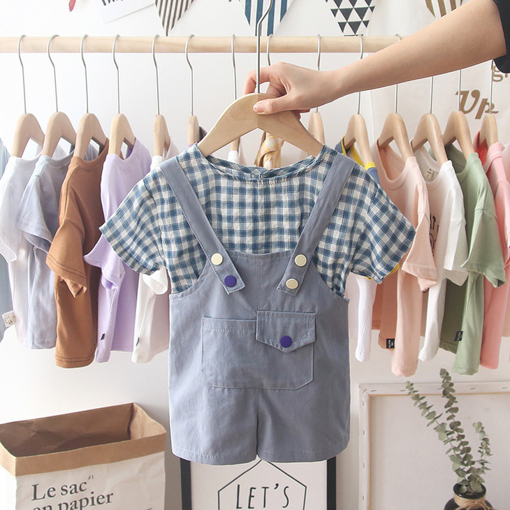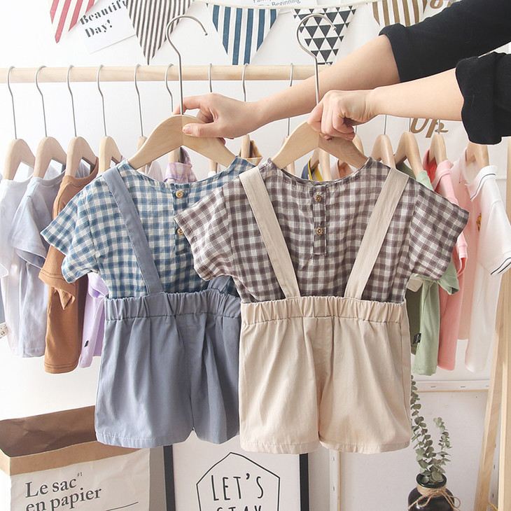 【童装】。宝宝童装夏装韩版格子短袖T恤中小童背带裤男孩两件套