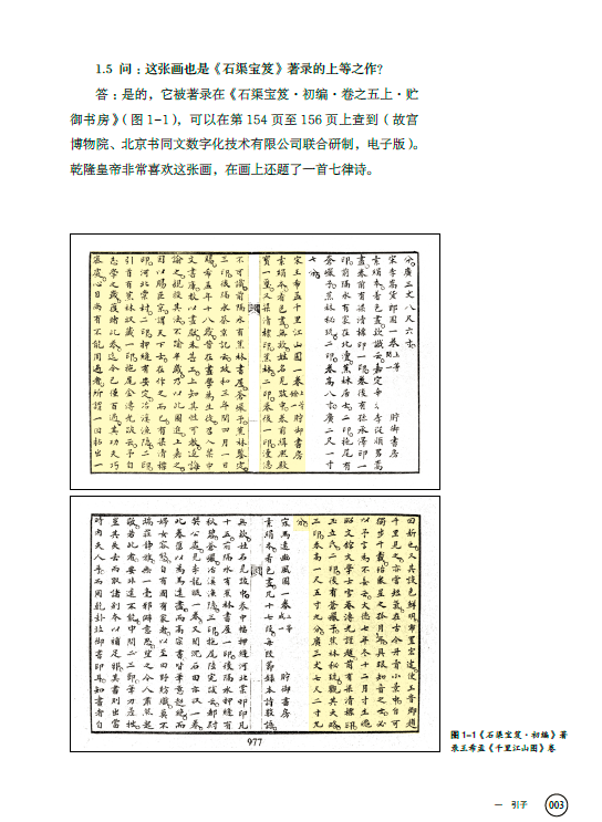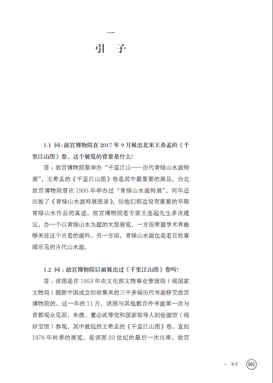 本书以轻松对话的方式,较全面深入地讨论了北宋王希孟及其《千里江山图》卷的数百疑问。运用证据学、逻辑学、地质学和野外考查等研究方法,以及寻找、使用物证的手段,解开层层谜底。作者首先通过内容分析、笔迹鉴定和材料检测,确信蔡京题文为真迹,证实了王希孟曾经是一个真实的存在,其姓氏和早卒的信息极可能来自卷外包首上的旧签(已佚)。根据北宋的神童制度,发现宋徽宗、蔡京与王希孟之间不同寻常的关系。据图中以庐山、鄱阳湖为主的景观并佐以闽东南、苏州利往桥等地的景物,推定王希孟早年的游历路线。全卷的核心内容是表现孟浩然《彭蠡湖中望庐山》的诗意。该图和当时一批重彩绘画的出现,意味着徽宗在世俗画家和文人画家的审美观念之外,建立了皇家雍容华贵的绘画审美观。随着该图在宋金元明清的辗转流传,其超长的构图形式和青绿设色方式对后世山水画产生一定的艺术影响。