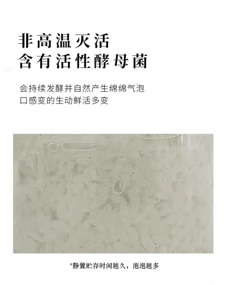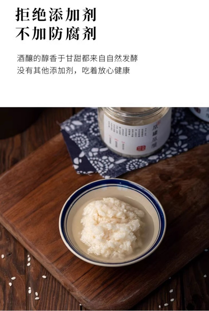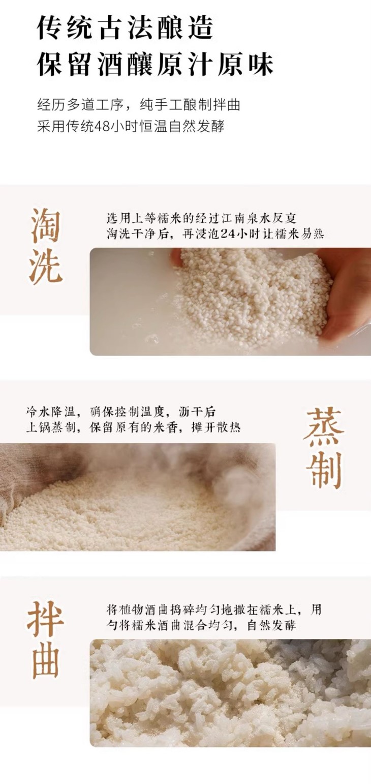 水止一食的气泡酒酿,用的是东北五常糯米,颗粒饱满、柔糯不硬,是酿造高品质米酒的理想之选。酿造过程严格遵循传统工艺,经过24小时充分浸泡,使糯米吸水膨胀,再用传统木桶蒸制,确保软糯透彻,再用手工拌曲的方式,以及48小时的恒温自然发酵,使米酒口感更加醇厚,风味独特。值得一提的是,不止一食还运用非高温灭活技术,保留了米酒中的活性酵母菌,让我们在品尝时仍能感受到那鲜甜的“冒泡”口感,每一口都充满了生命的活力。随着时间的延长,口味也会一点点改变,从刚开始甜滋滋的,到后期酒味会越来越浓,泡泡也越来越多。没有兑水兑糖调味,拒绝食品添加剂,不加防腐剂,酒釀的醇香甘甜都来自自然发酵,放心!
