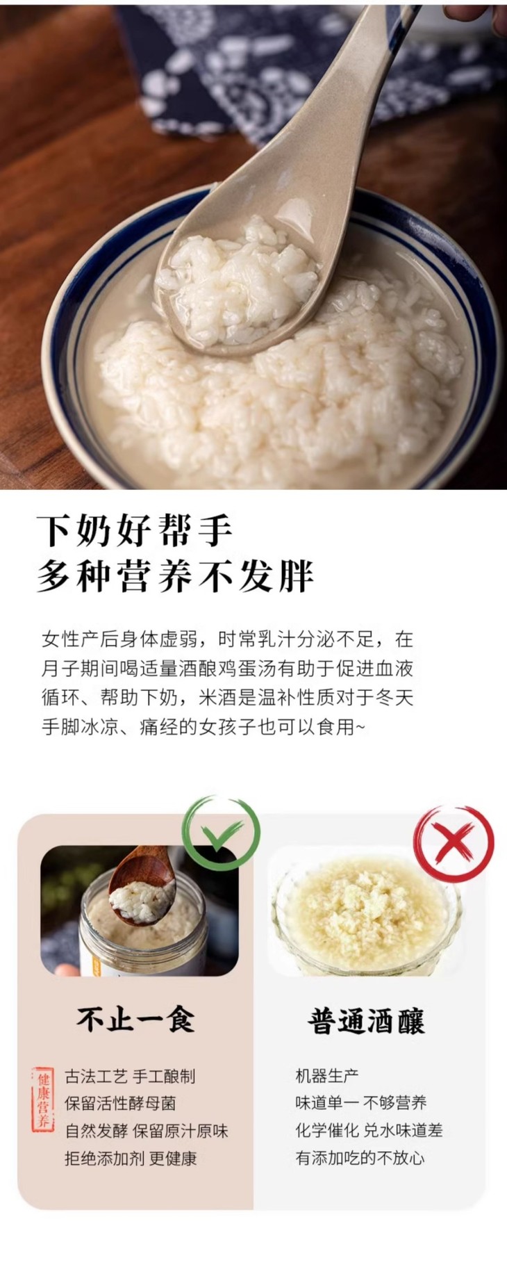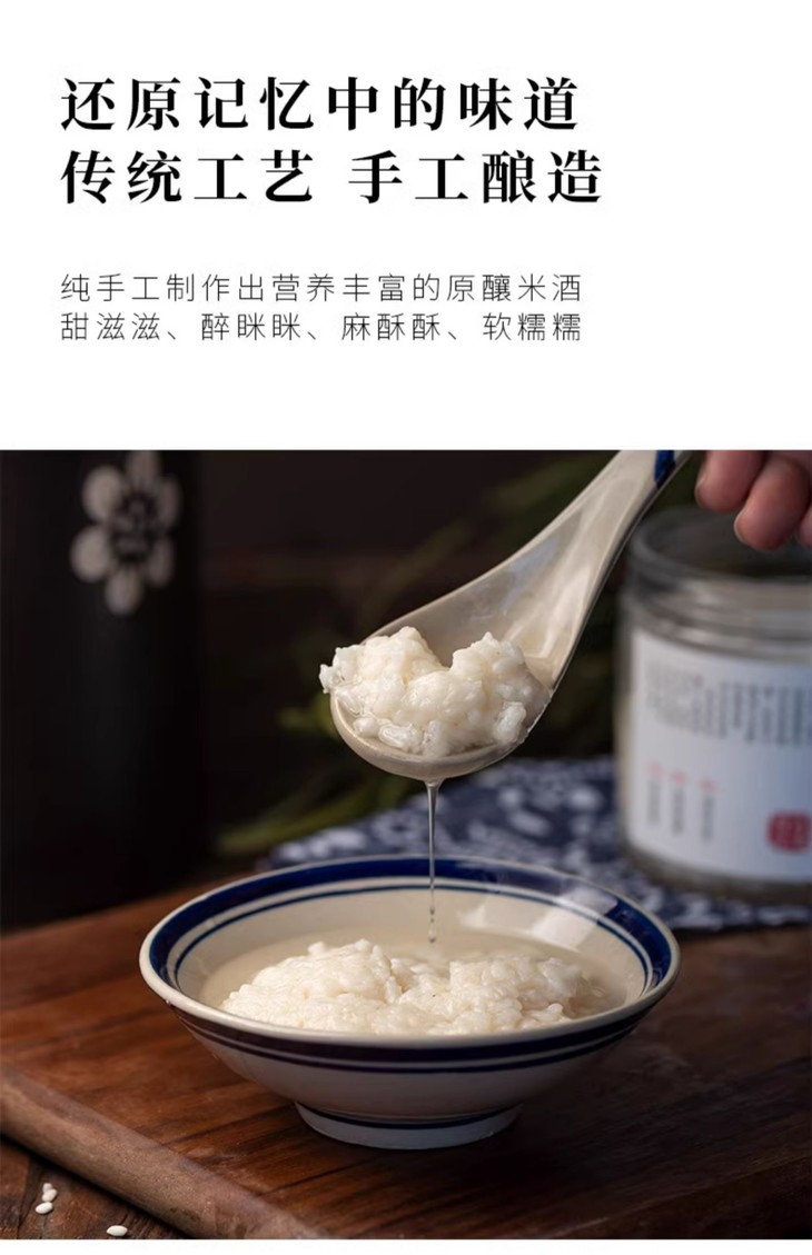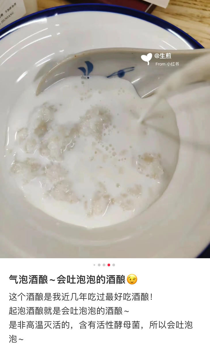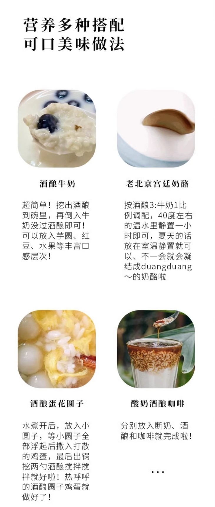 泡泡酒酿是开盖即食的,直接舀一小勺,清甜的米香与醇厚的酒味,包裹着粒粒饱满的糯米,细腻又带嚼劲,不是齁甜的哦,单吃都ok!更江南的做法肯定是酒酿小圆子,也有组合,甜甜的酒酿加上糯叽叽的小圆子,再撒上一把桂花,那简直了!姨妈时还可以再来个酒酿窝蛋,糯米一抿就化,一碗下肚,整个人暖乎乎,果然是月子必吃,感觉好补气血呀!当然也很推荐当下很流行的酒酿牛奶、酒酿酸奶咖啡、汽泡酒酿、抹茶酒酿。。。大家可以发挥下自己的小宇宙,diy自己的特色饮品,味道,就看手艺了!