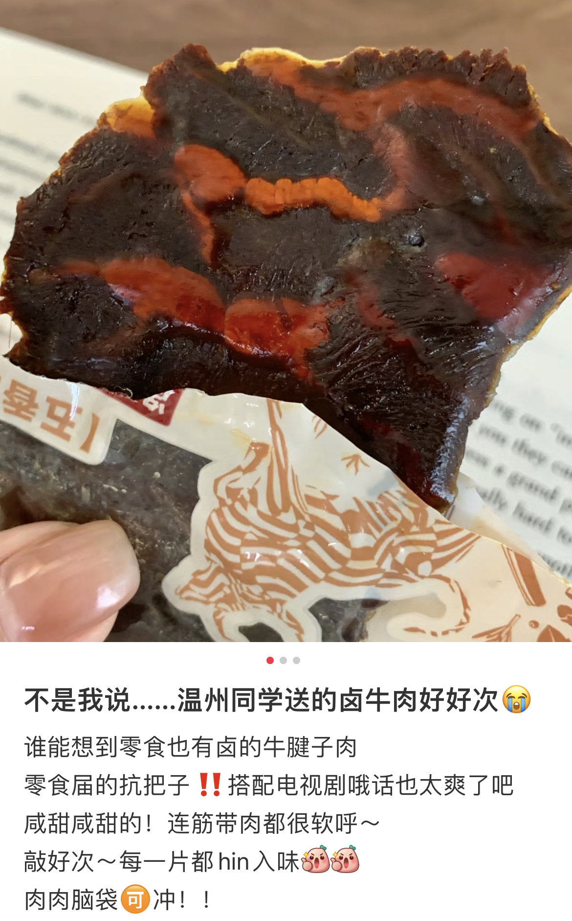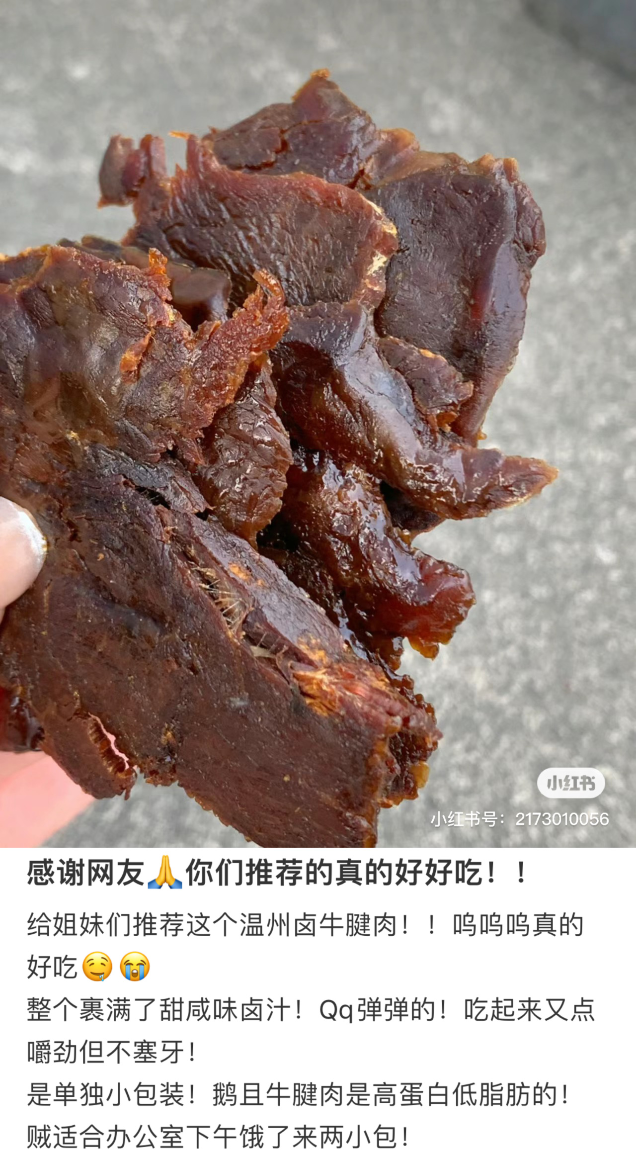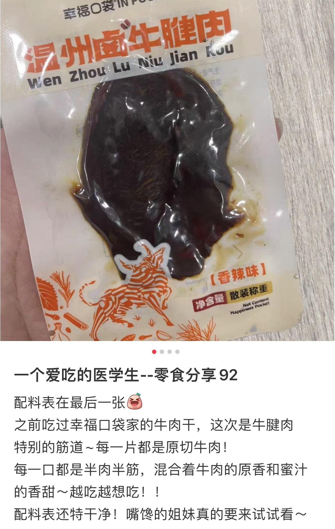 幸福口袋的牛腱肉来咯,超适合减脂人,可以当蛋白质!口味和小盒装牛肉干差不多,但更多牛筋,就更好嚼了,纹理清晰,不柴不硬,是湿湿的那种,还可以用手撕着吃,和鱿鱼条可以拼一拼哦!包装有更方便,是单片真空锁鲜,真的是可以放口袋的小幸福!不过提醒下,江浙口味,是有带甜的,就算是辣味的,也带点点甜,川渝胃注意一下!