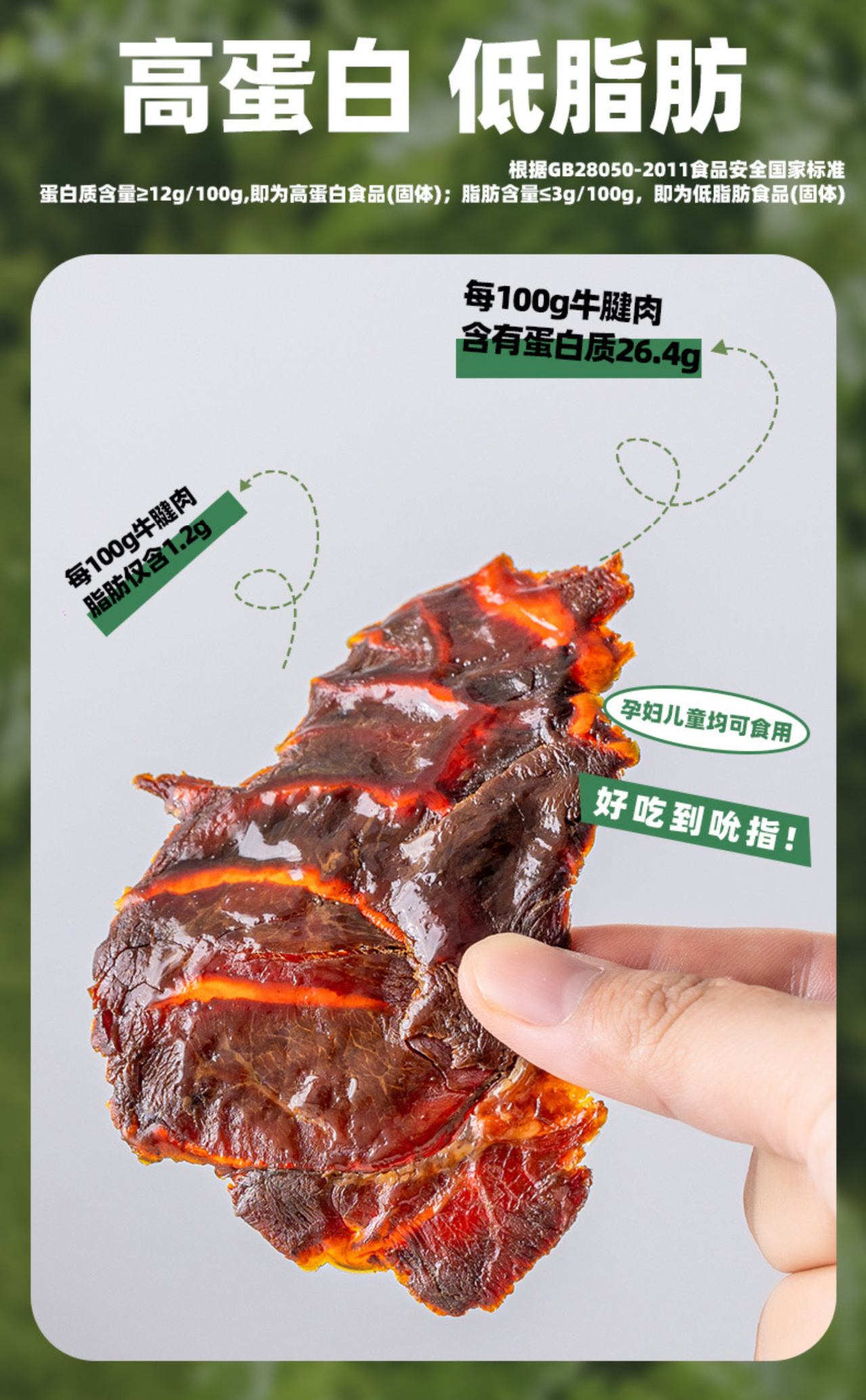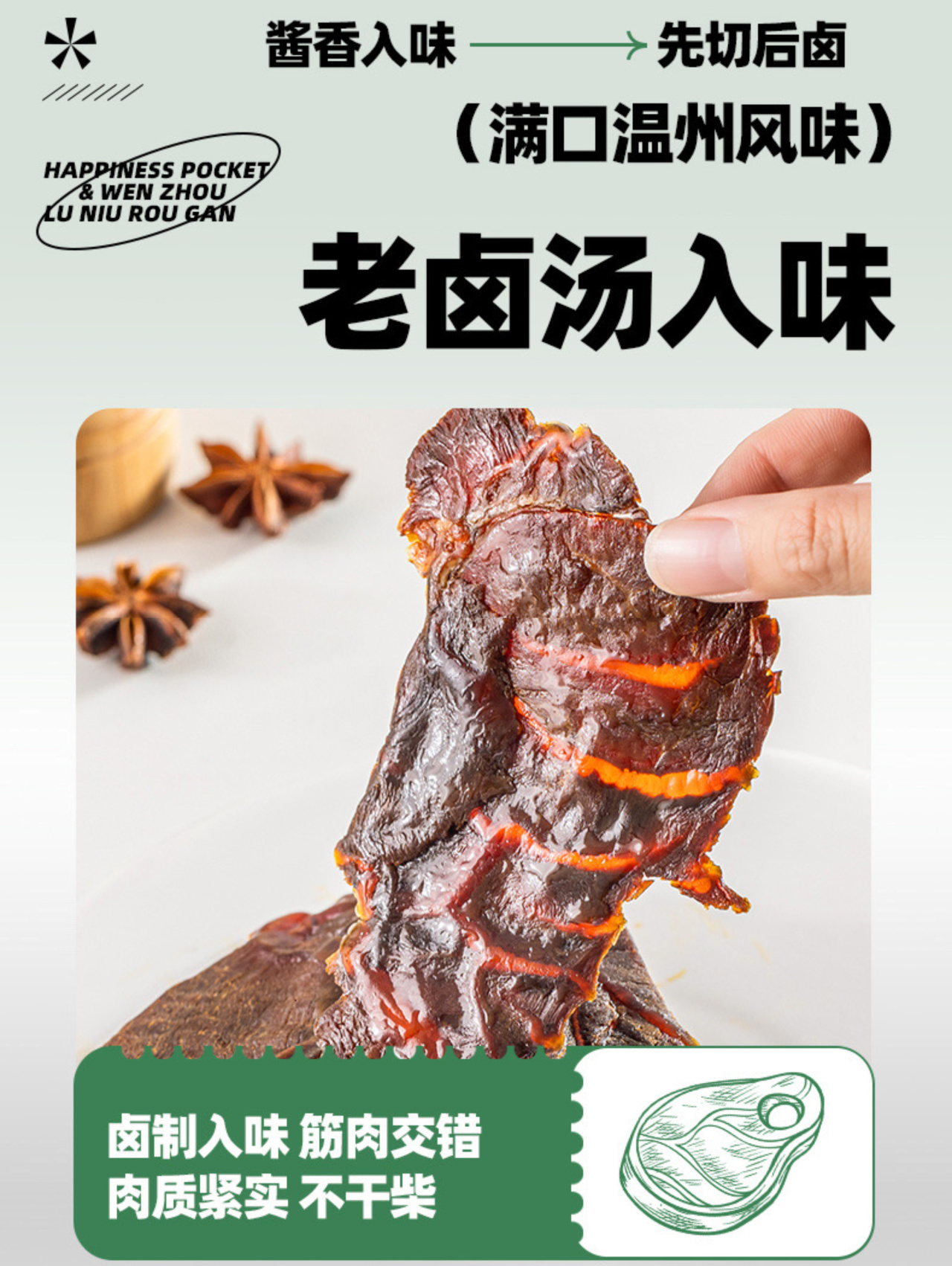 和常见的风干牛肉不同,卤牛腱肉是先卤后烤的,用秘制老卤汤文火慢卤数小时,让每一片牛肉都充分吸饱汤汁,慢熬入味后,再辅以烘烤,令牛肉变得更有韧劲,且还有火烤的香气。这样做出来的牛肉干,醇香入味,口感是偏湿润的,不费咬肌,越嚼越香!牛腱肉的用料也是实打实,优质草饲黄牛,精选牛腱部位,一整块原切,完整的肉质纤维和明显的大理石花纹清晰可见,不掺假不合成,不额外添加面粉和大豆蛋白,配料表也很干净,都是常见的佐料,但却有独特的配方哦!制作过程中不添加香精、色素、防腐剂,老人小孩减脂人都可以放心吃!