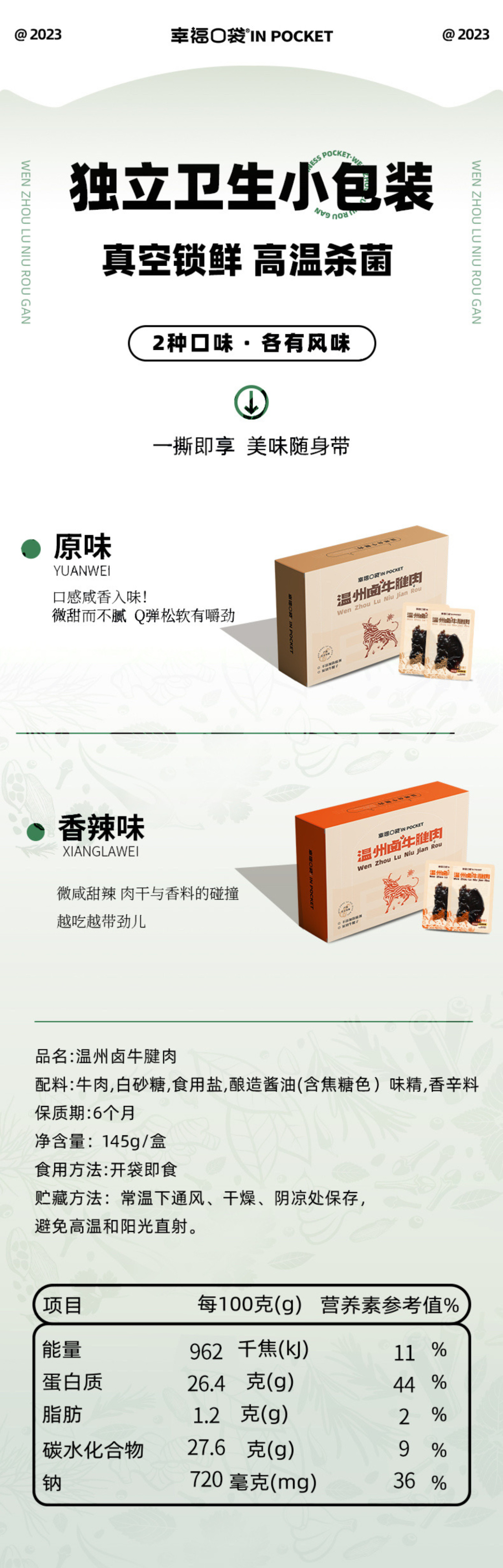 有原味和香辣味。原味的肉香纯粹,带几分甜,保留了温州卤味的口感,但并不会腻,非常适口,香辣味在配料上稍微加重了香辛料的比例,带有微微的辣,口感更丰富,但很适中,不会掩盖牛肉本身的风味,反而更激发了鲜味,再加上韧韧滑滑的口感,很有嚼头,又不会发硬,牙口不好的朋友也能放心吃!牛腱肉还是高蛋白低脂肪的优质小肉肉,懒得开火时,拆个几包,配上青菜薯薯,也可以混一餐了,还能很好地控制热量的摄入哦!