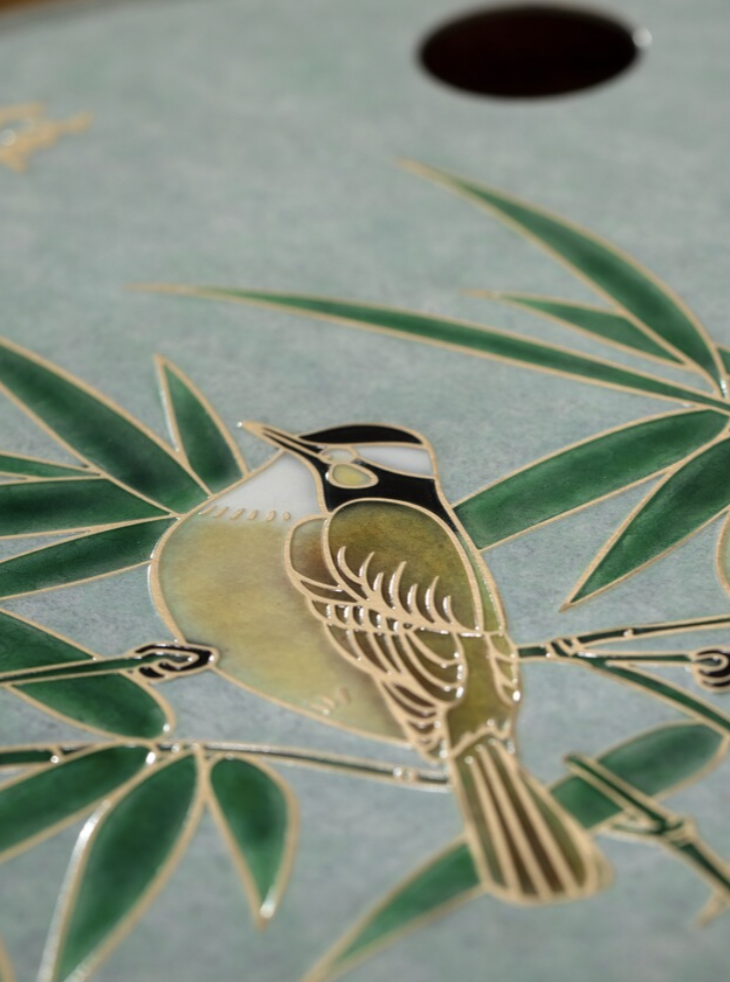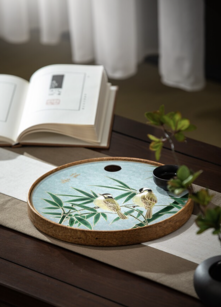 居无竹不雅,院无鸟不欢。竹报平安,喜报佳音,诗意一般的美物,给茶生活增添浓郁的艺术感。以清宫旧藏宋画经典《白头丛竹图》而设计,图绘小竹数竿,清翠嫩绿,两只白头鹎栖于枝头,双鹊鸣喜,好运到来,充满幸福喜跃的氛围。采用国家非遗百年铜雕技艺精制,天然山岗老竹茶盘,与盘面竹景遥相呼应;盘面采用秘制矿物颜料高温釉彩着色绘制,双雀用淡彩层层晕染,再以尖毫细笔绘出绒羽,刻画准确,富有毛绒的质感。