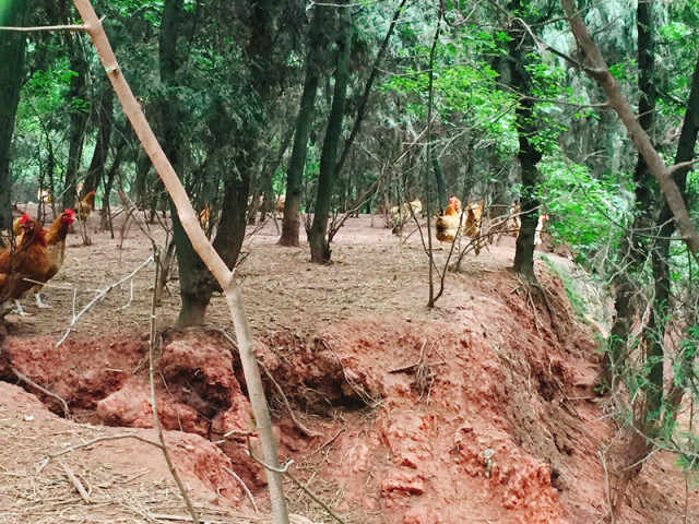 农场山地放养鸡的品种为苏禽草鸡,产蛋率适中,抵抗力强,适合放养。