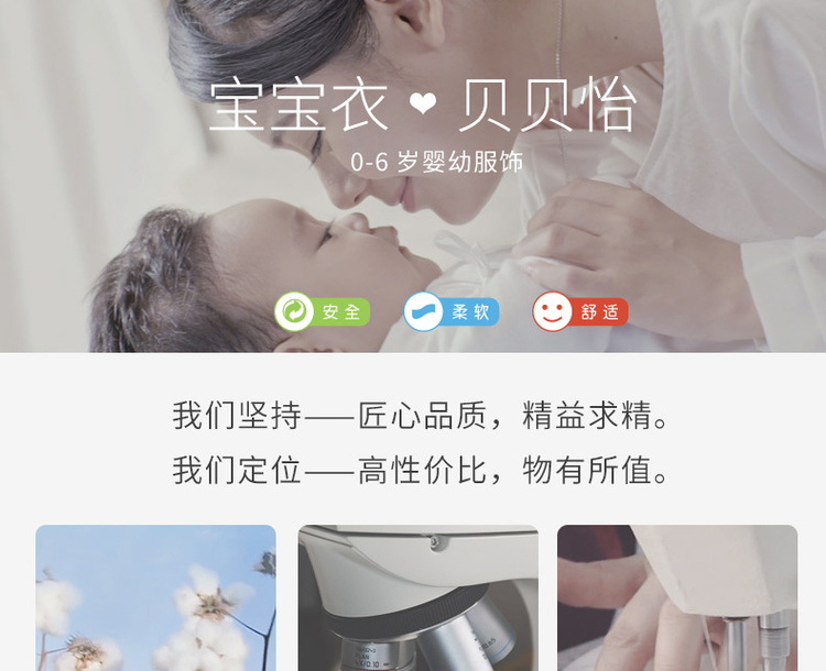 - 贝贝怡专注0-6岁婴幼儿服饰,坚持安全、柔软、舒适的产品理念,为千万中国家庭提供超高品质、安全可靠的婴幼儿服饰产品,妈妈放心,宝宝开心!