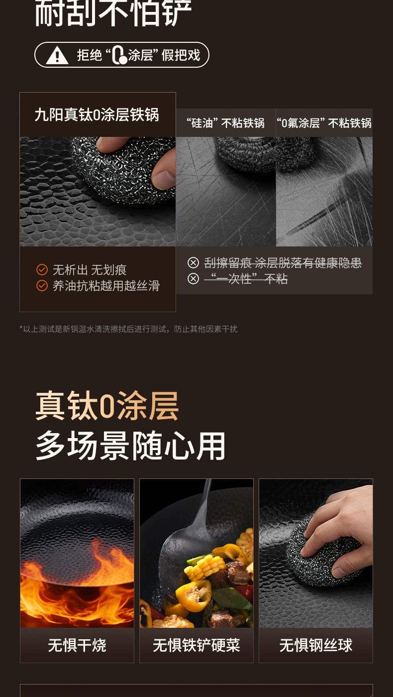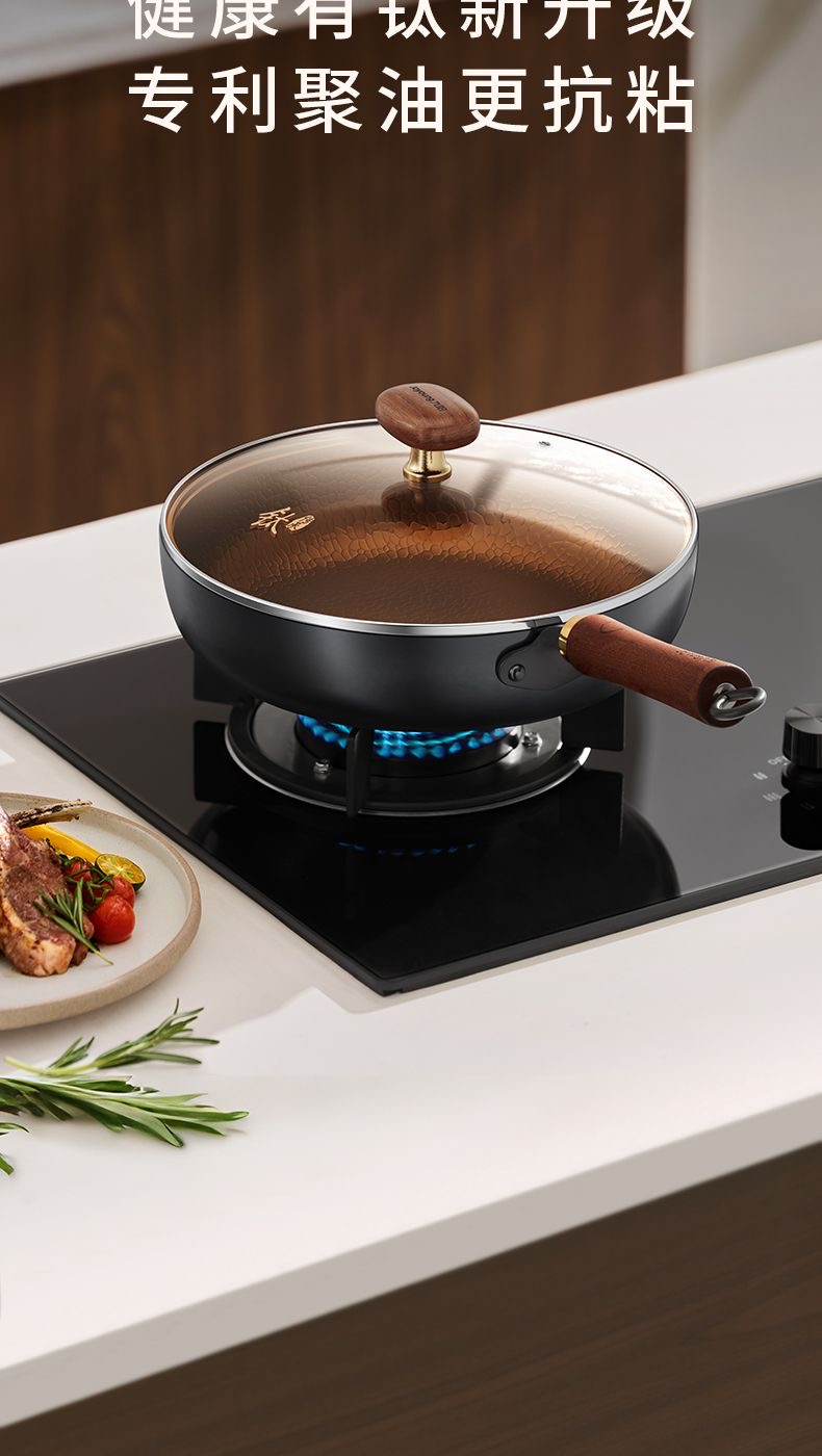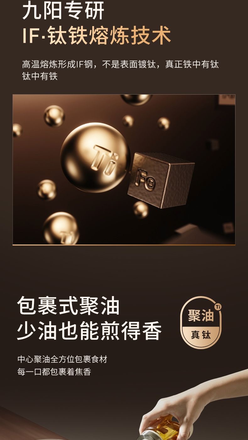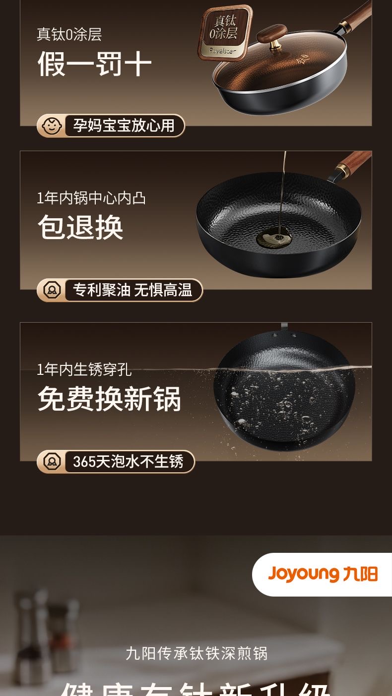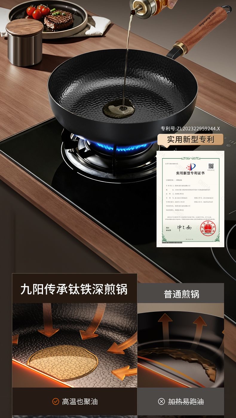 九阳钛铁深煎锅二代真钛0涂层平底聚油双重抗粘氮化防锈磁灶通用
