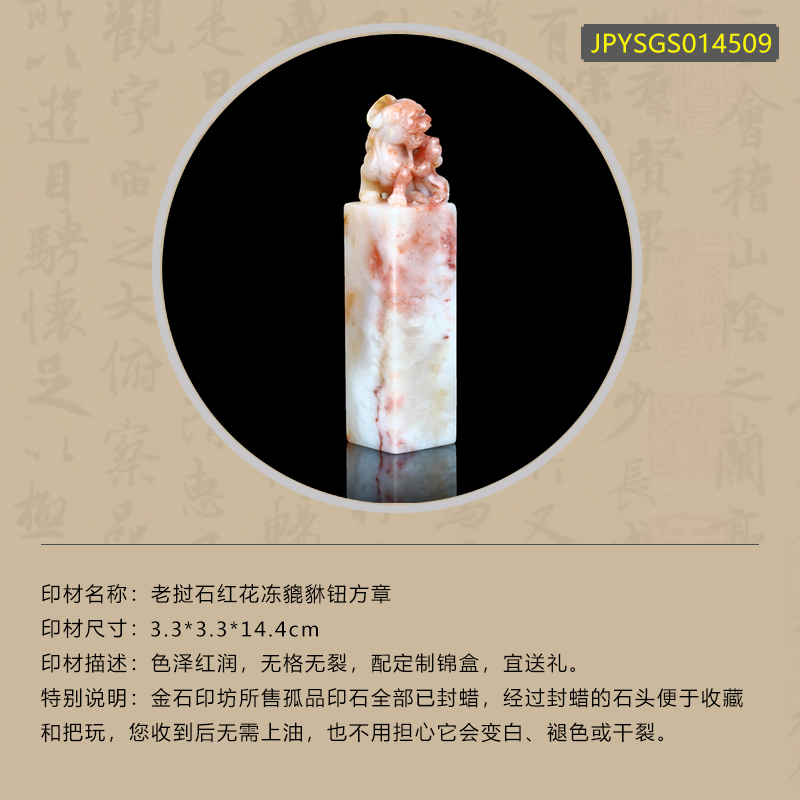 孤品014509:老挝石红花冻貔貅钮方章-3.3*3.3*14.4cm