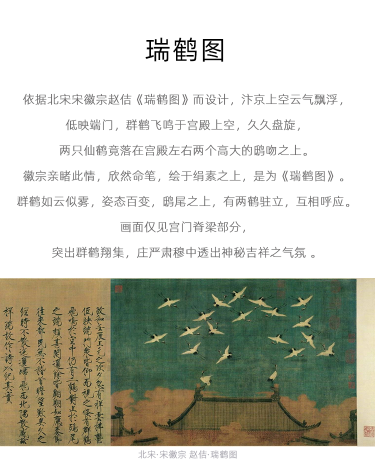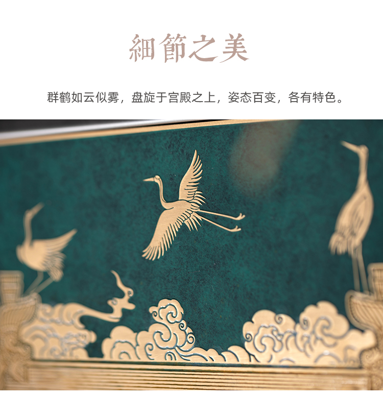 产品介绍:依宋徽宗《瑞鹤图》而设计,身刻瑞鹤图案,生动自然,承袭宋人风雅。鸟中圣贤,青云直上,飞黄腾达,长寿永泰。非遗技艺,清晰流畅。火中取色,千年璀璨。比例精妙,栩栩如生。