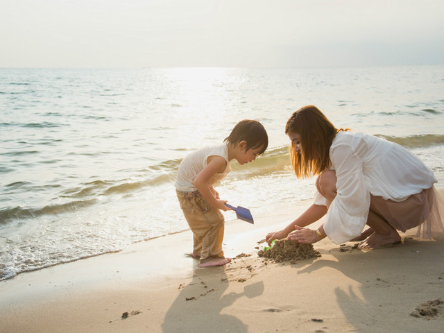和孩子一起拾贝壳、捉螃蟹、堆沙雕...