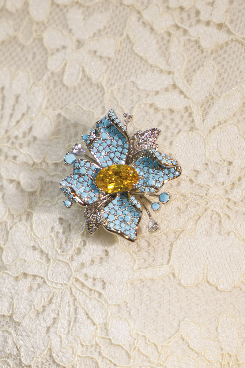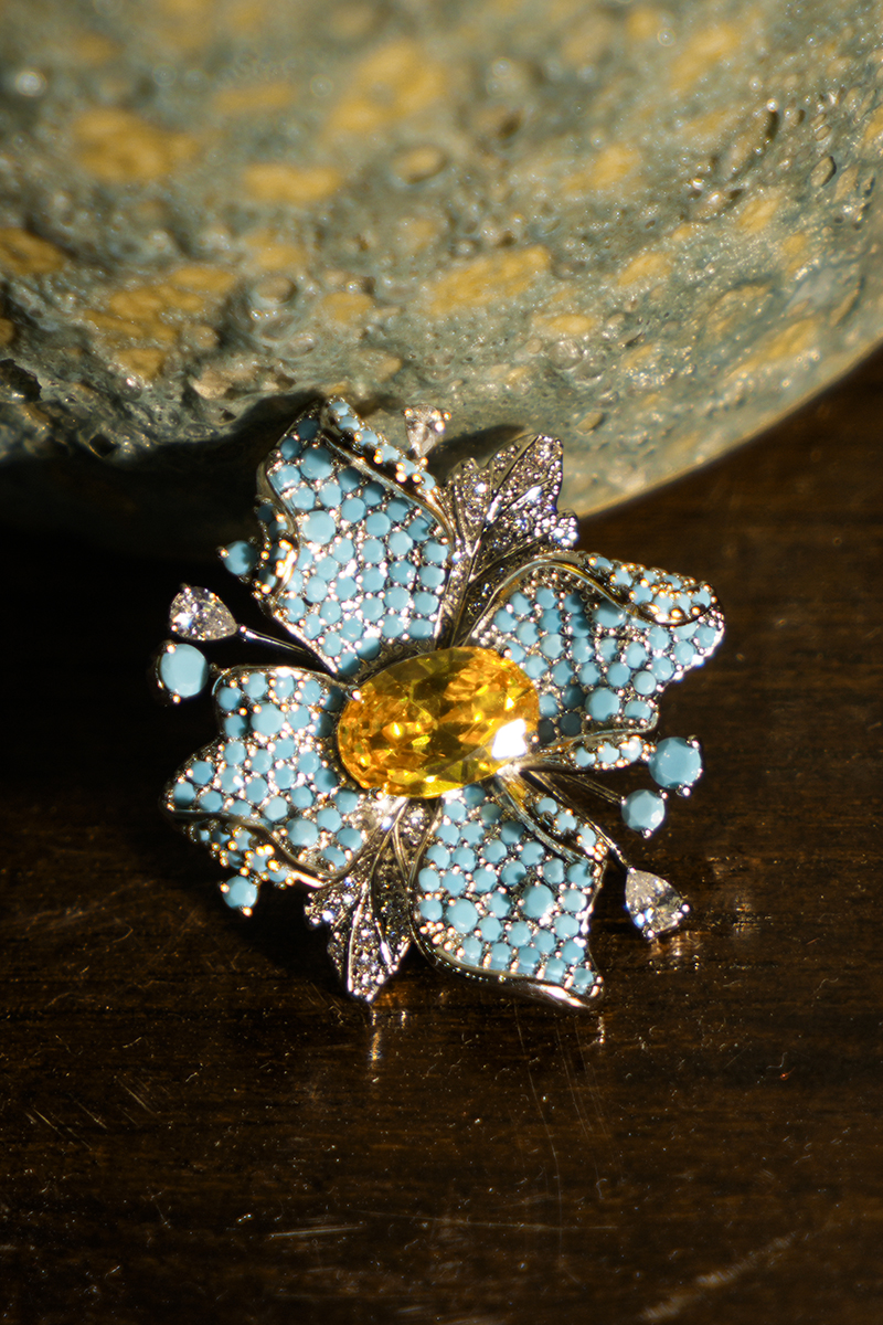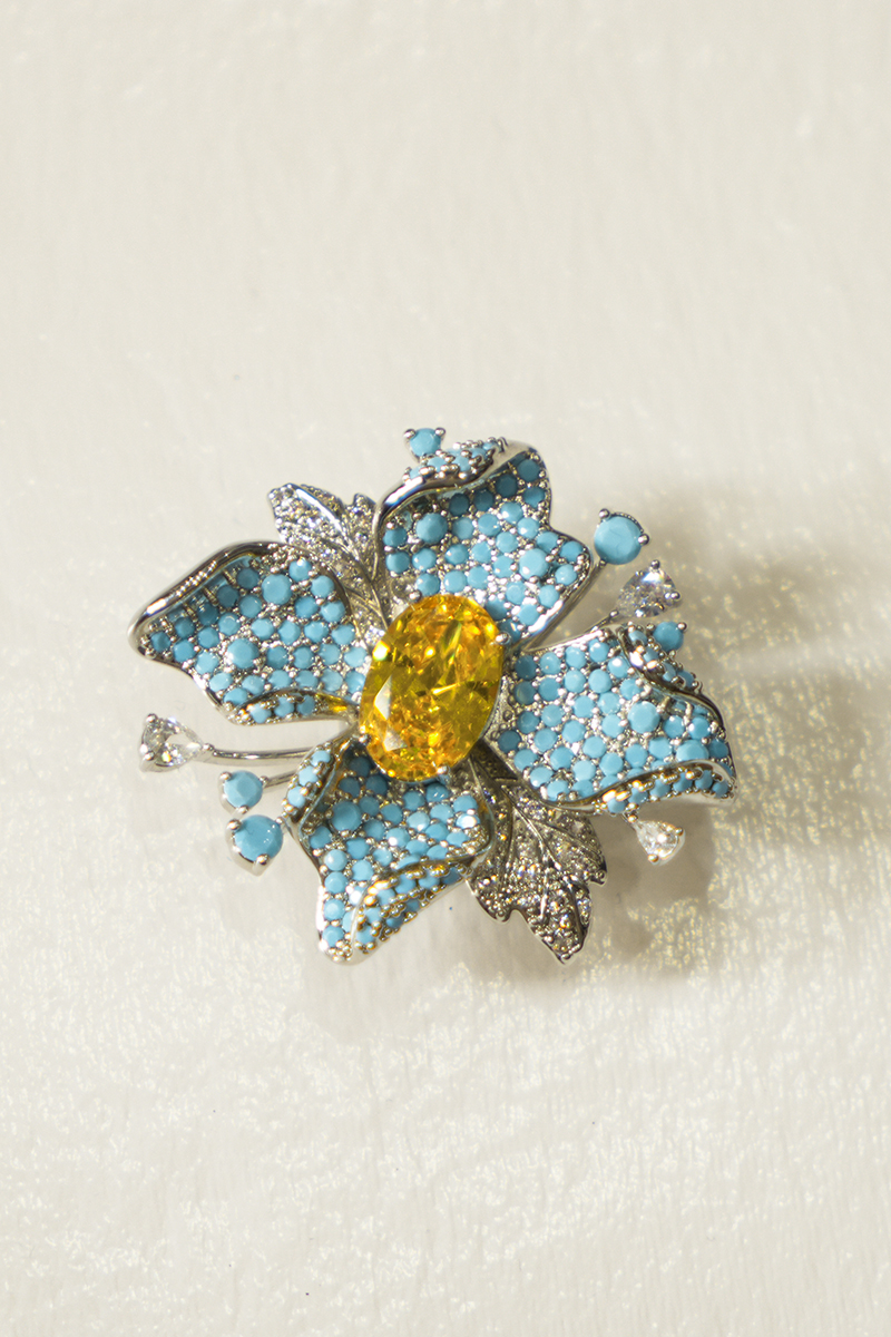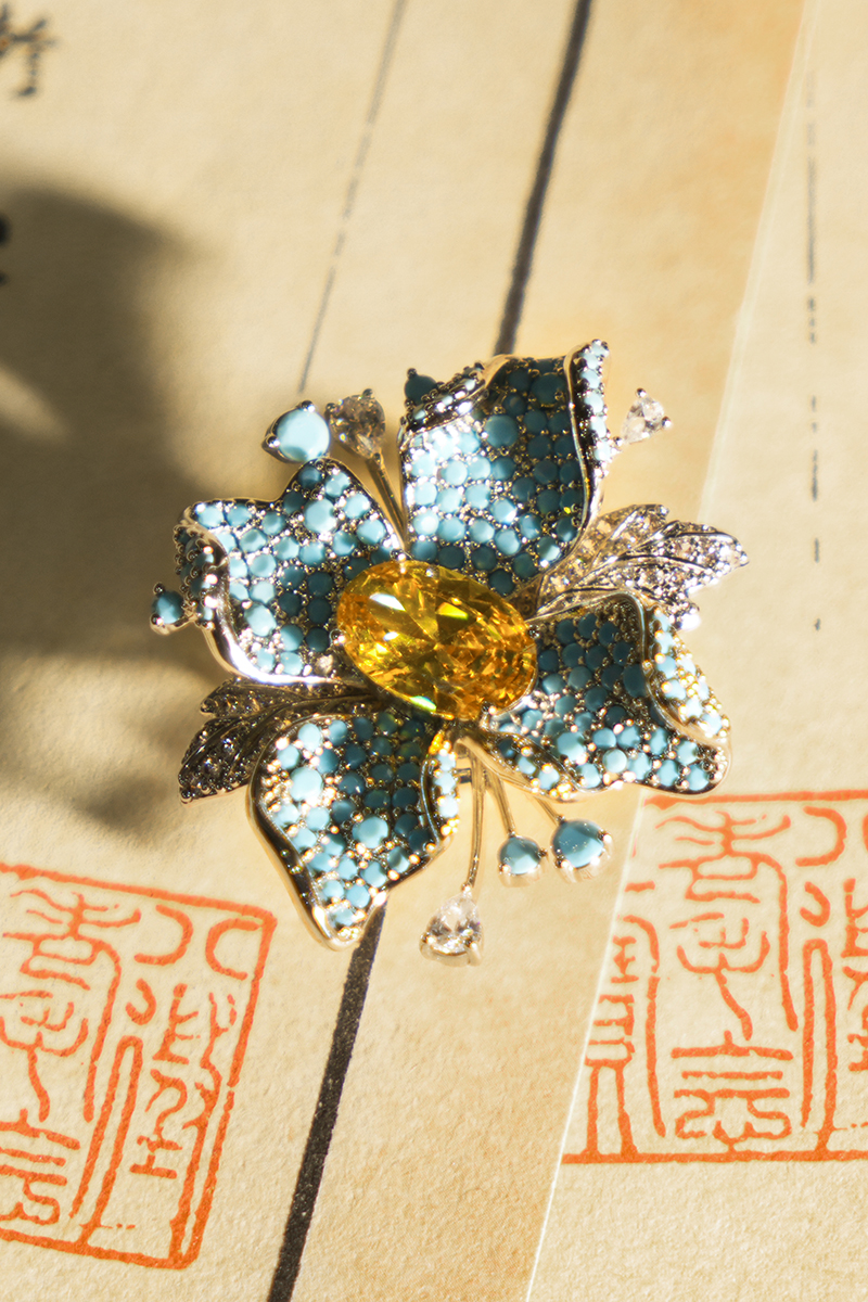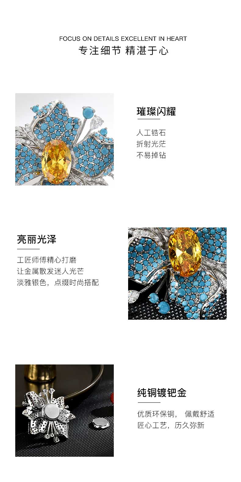材质采用铜镀18K金,微镶3A+锆石+珐琅彩,不同于市面的低端产品,一般是合金镀仿金的,色泽没有这么好,这枚胸针流光溢彩的,非常的漂亮~~!!
