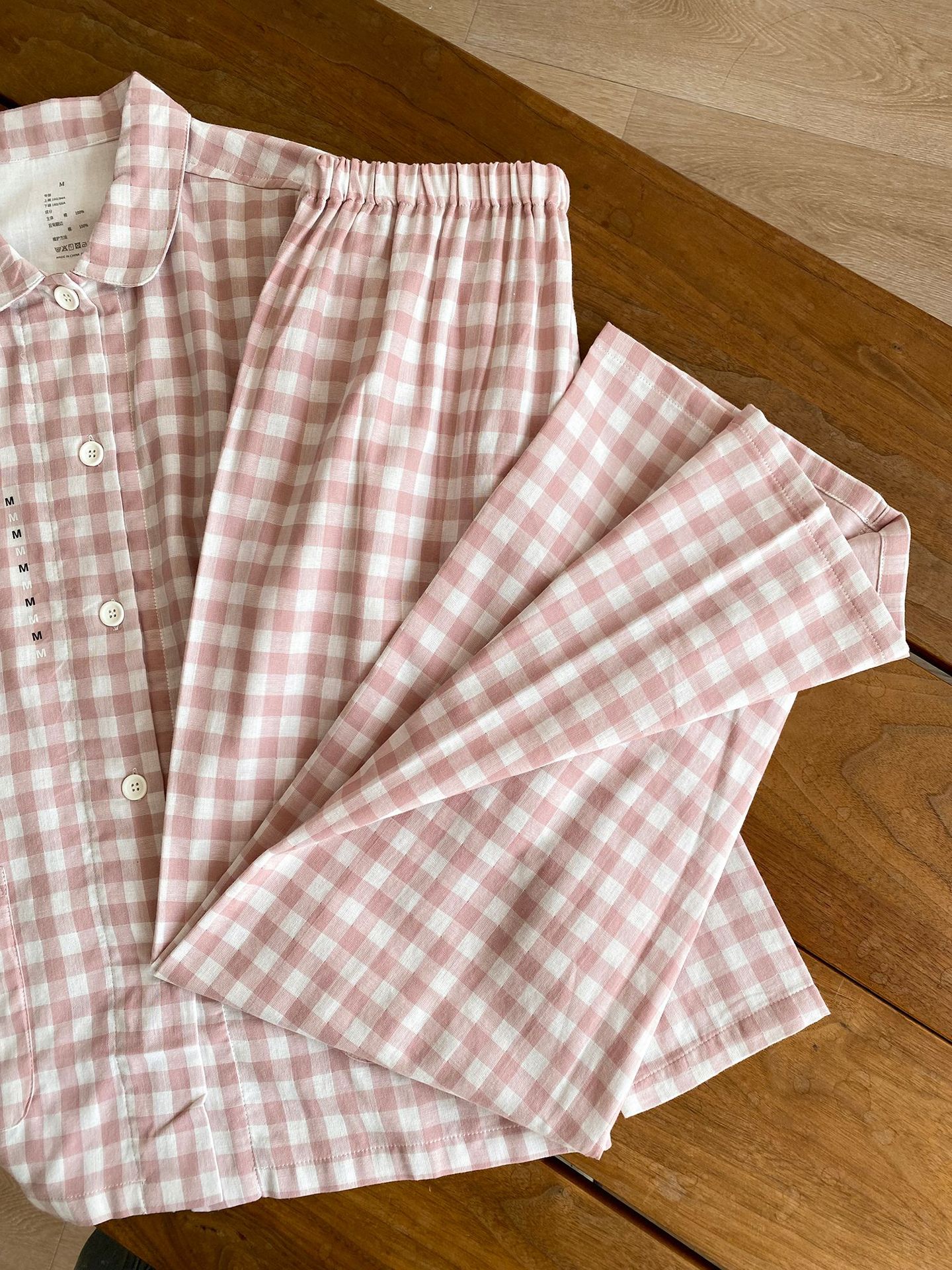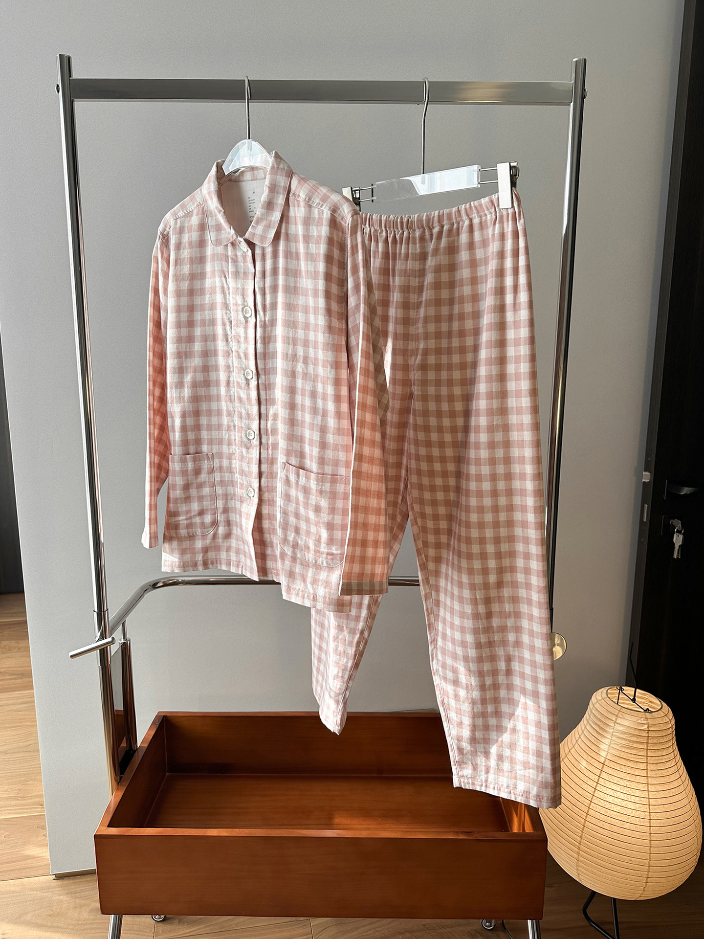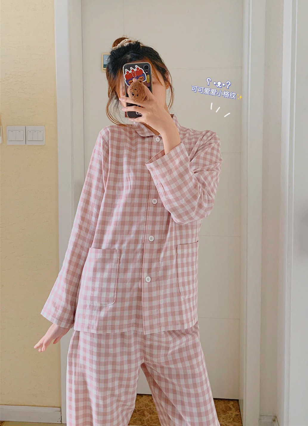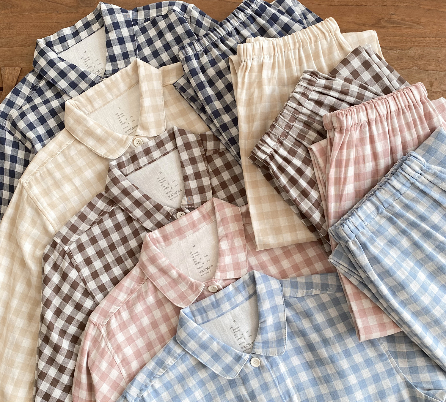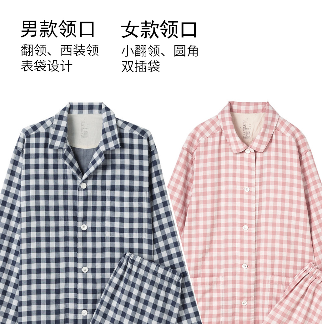 【双层纱睡衣】全棉双层纱睡衣套装无侧缝日式良品格子小点春夏情侣家居服套装