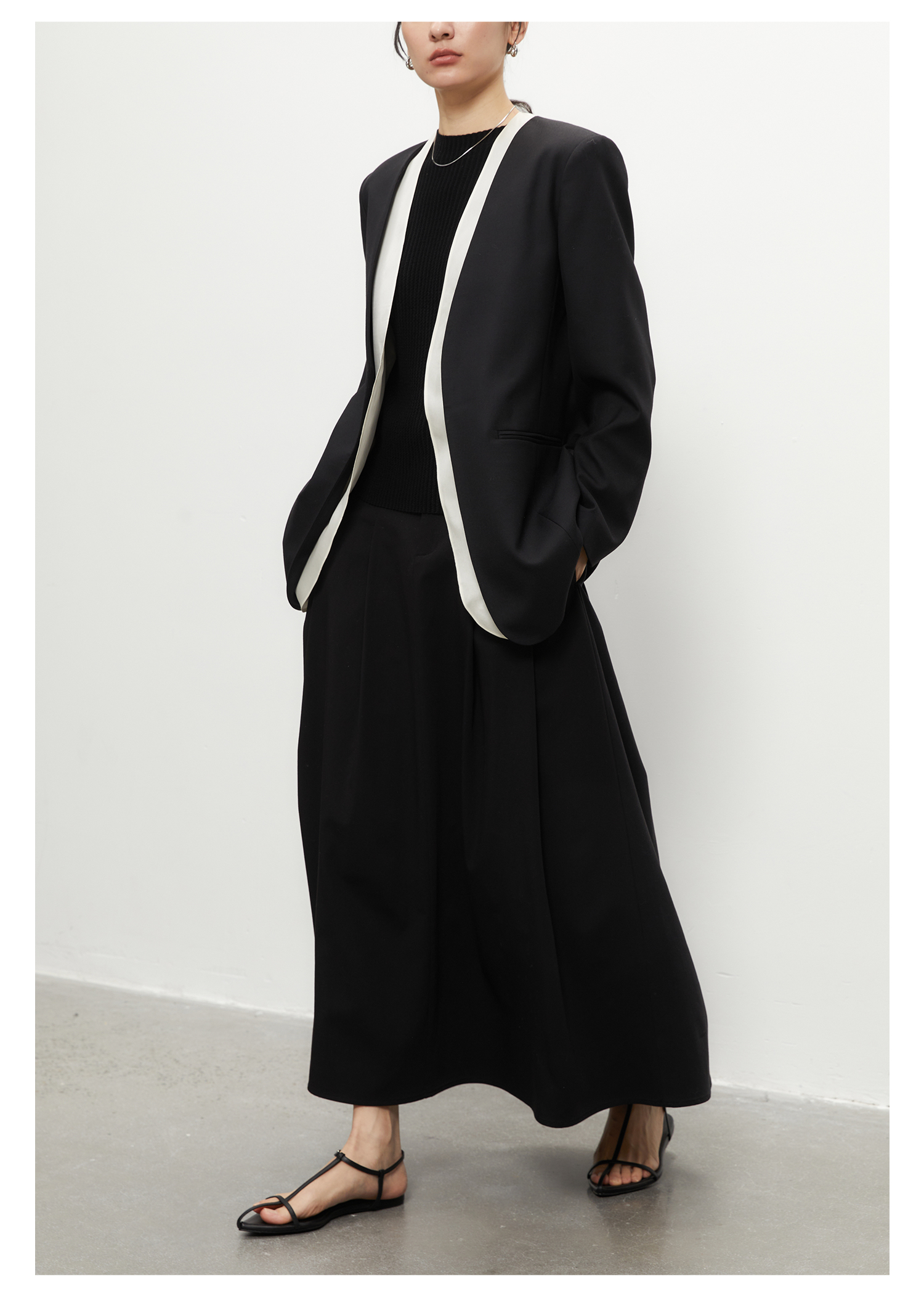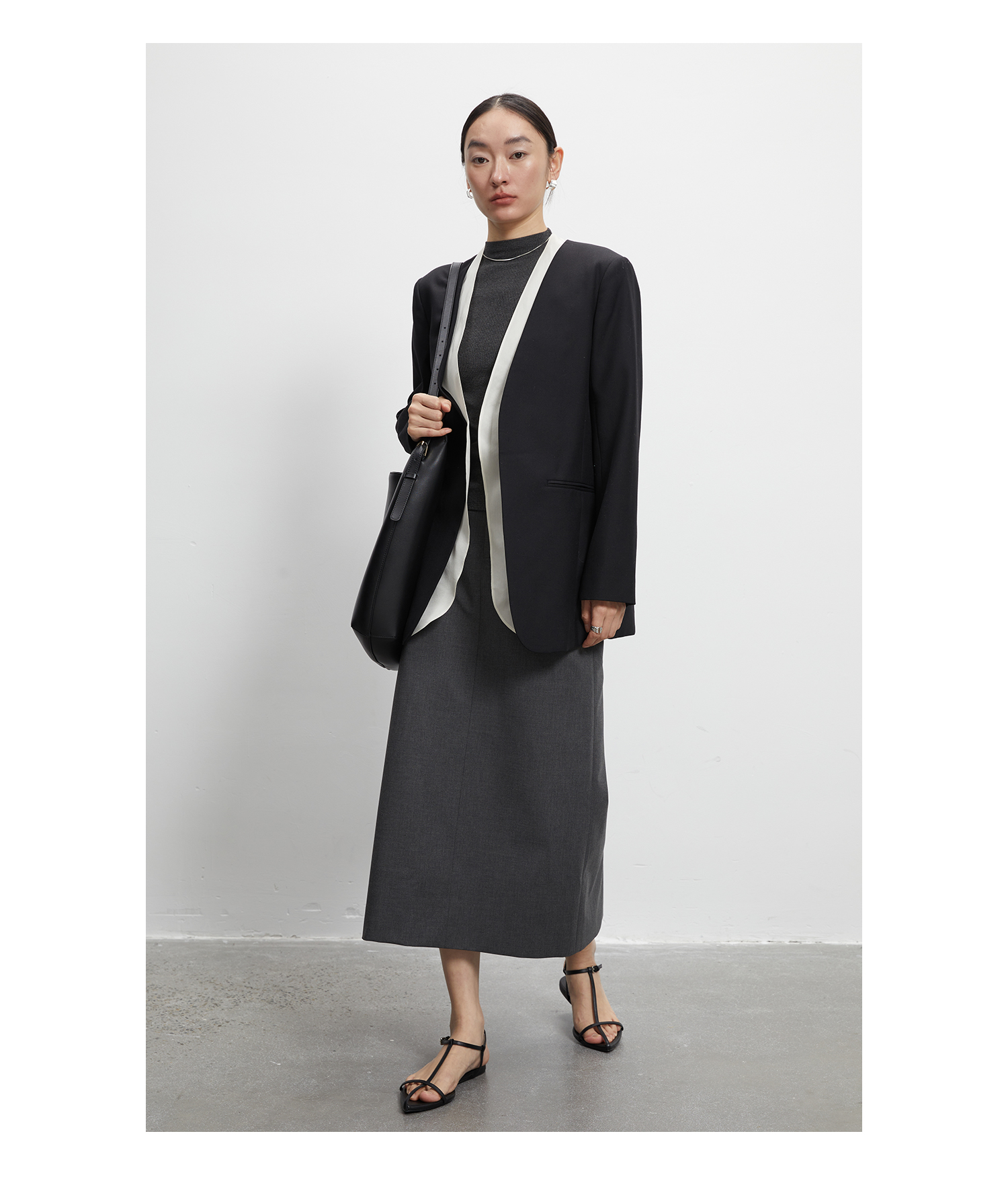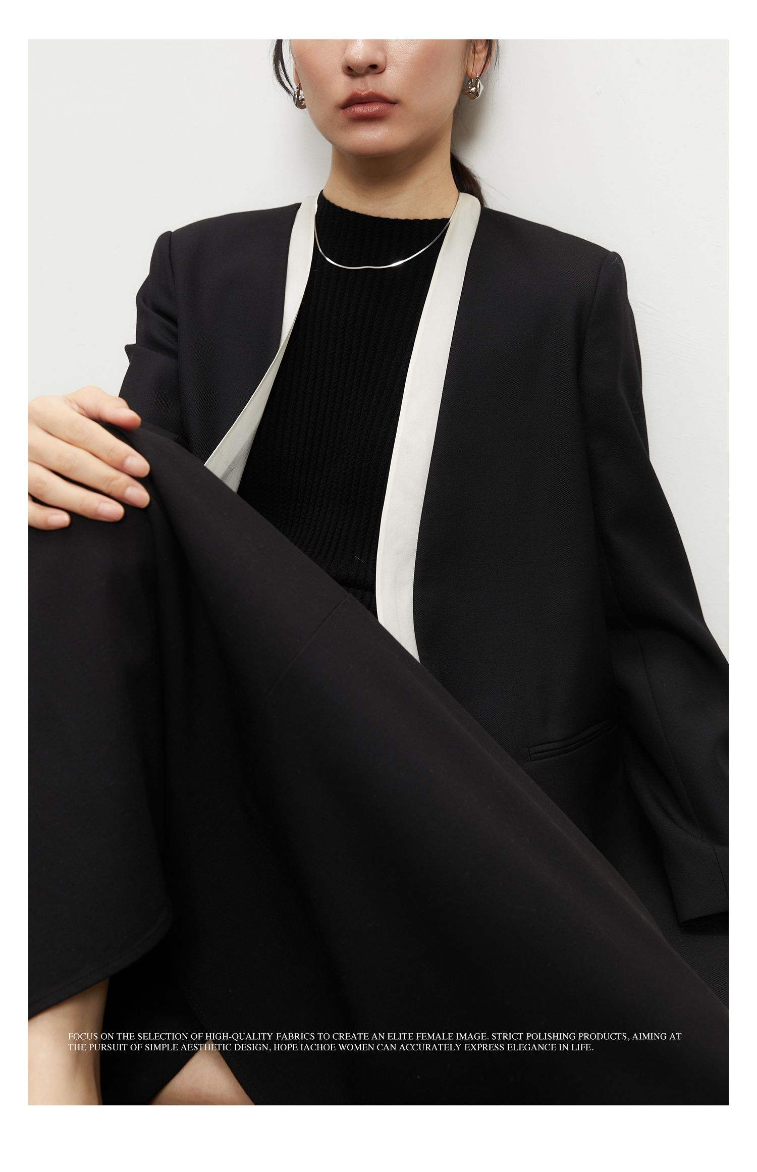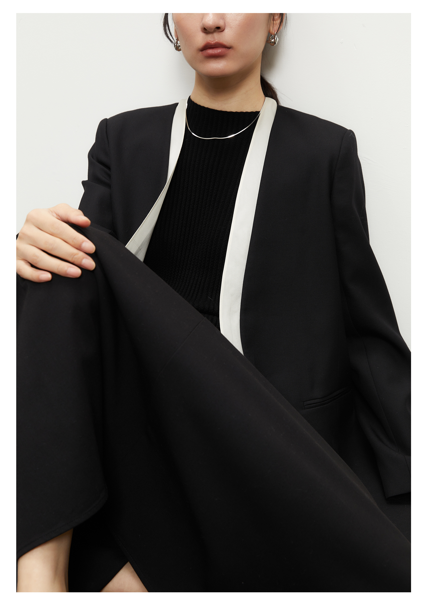 棉仓3521512004-真丝镶边 无领西装女 25秋简约撞色设计感羊毛针织西服外套