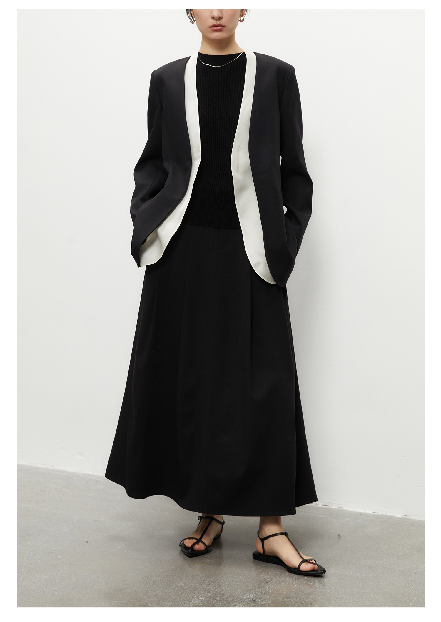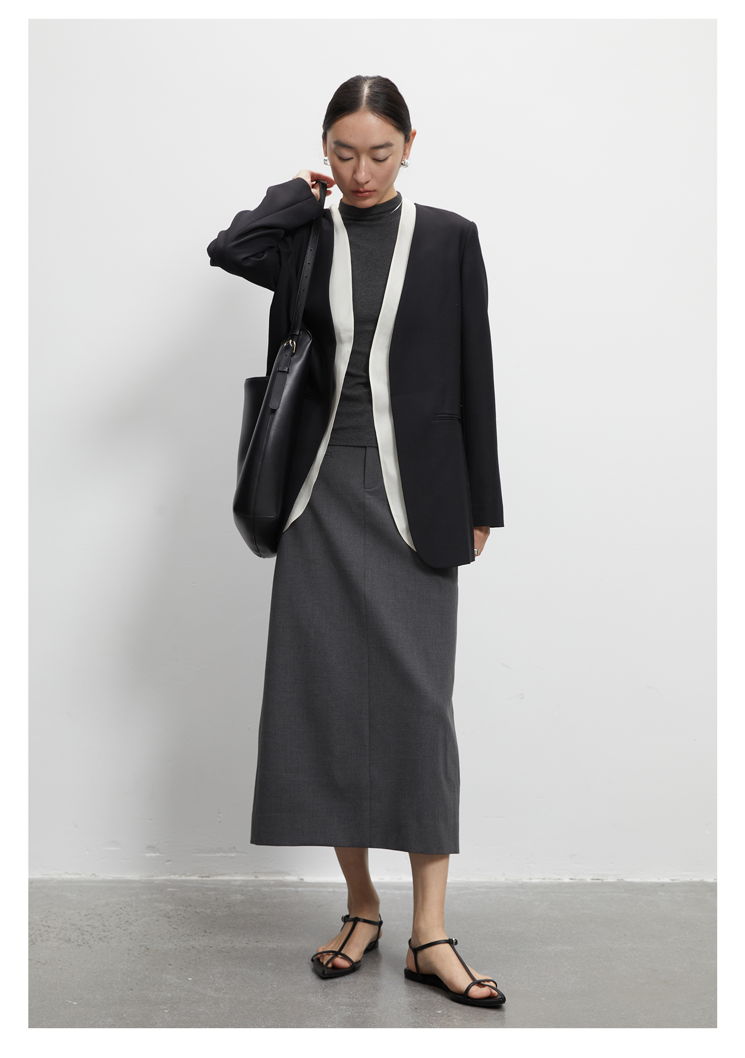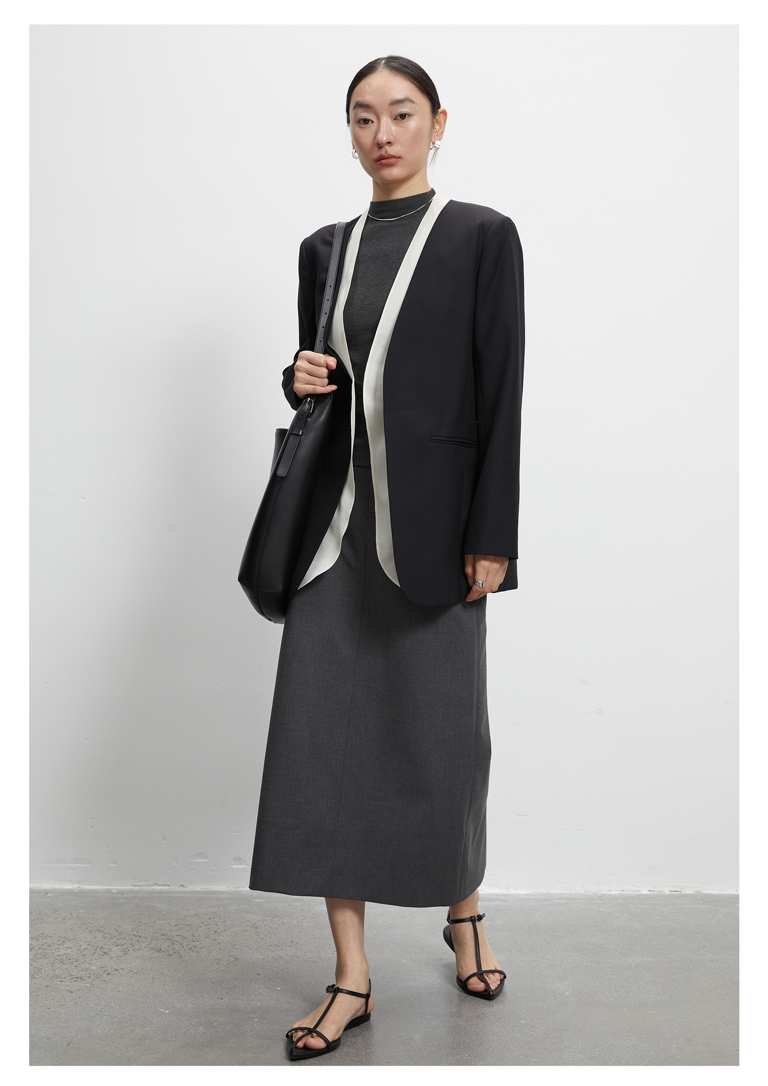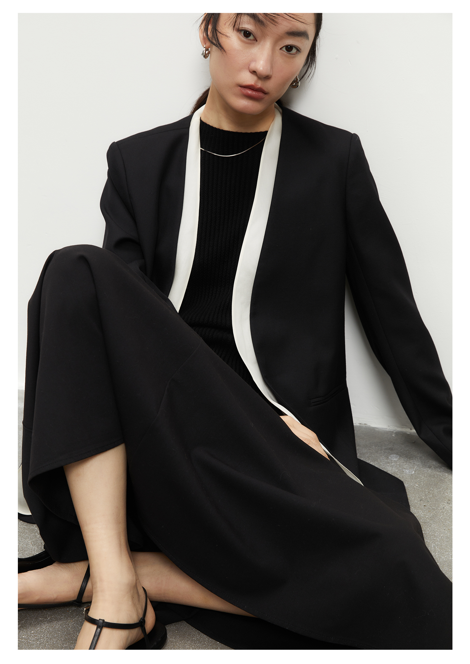 棉仓3521512004-真丝镶边 无领西装女 25秋简约撞色设计感羊毛针织西服外套