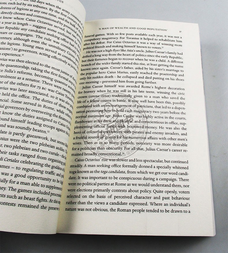 阿德里安·戈兹沃西凭借其掌握的丰富古代史料和娴熟的叙事技巧,以奥古斯都的军事和政治生涯为主,连贯地呈现了奥古斯都的一生。作者对奥古斯都的解读,既关注其戎马生涯,也注重他的从政经历;聚焦于奥古斯都本人,又将其置于宏观的社会背景之中,为读者呈现一个真实生动的,集军阀、独裁者、“祖国之父”形象于一身的奥古斯都。