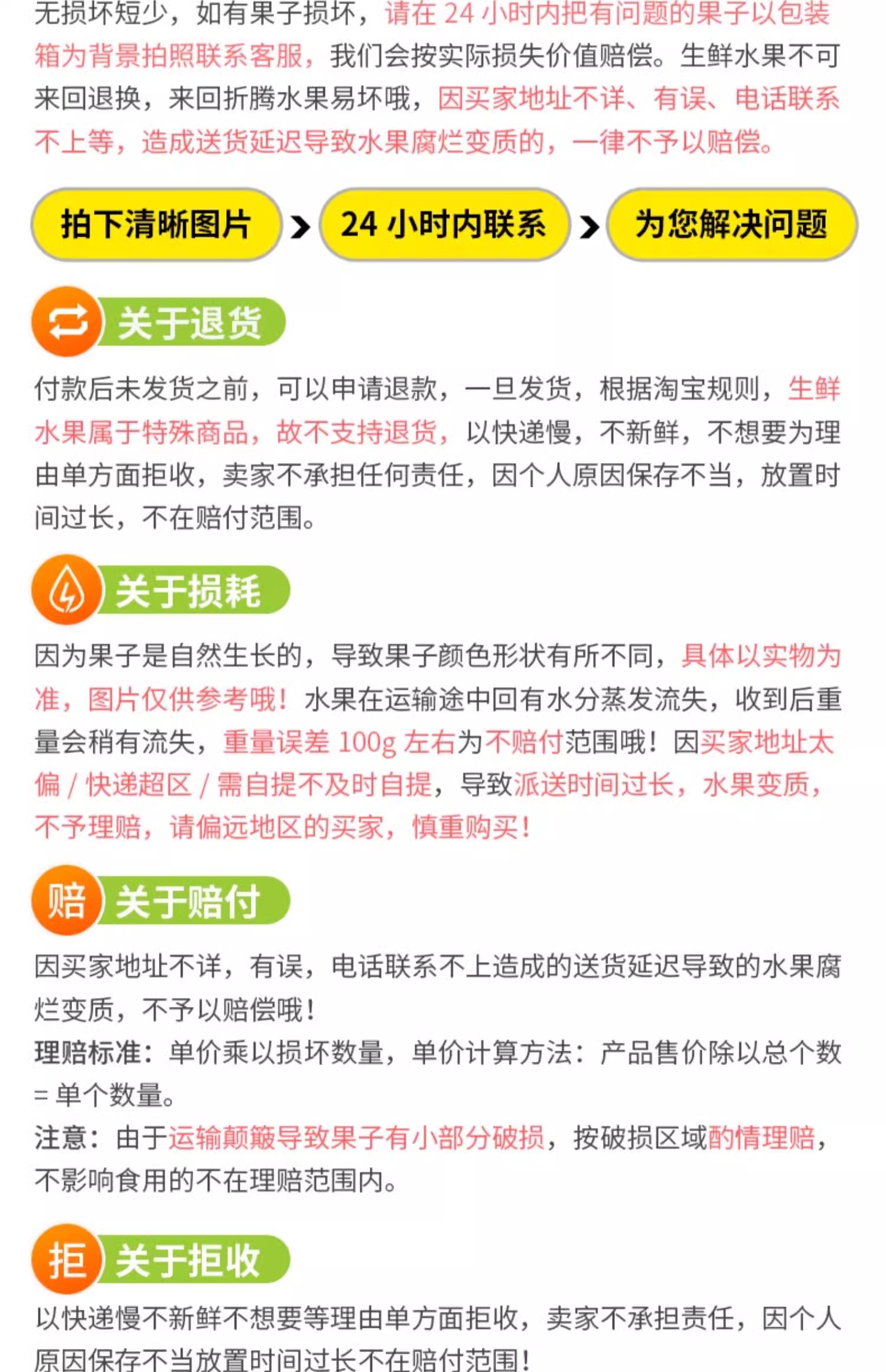 4,到货后,先签收,请在24小时内把快递单和坏果放一起拍照(能看到运单号、姓名,坏果情况),我们将根据果子实际损坏情况,按照“付款价格÷个数×坏果数量=赔付的金额”标准进行赔付