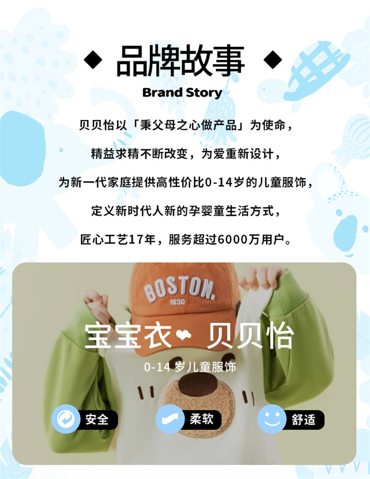 - 贝贝怡专注0-6岁婴幼儿服饰,坚持安全、柔软、舒适的产品理念,为千万中国家庭提供超高品质、安全可靠的婴幼儿服饰产品,妈妈放心,宝宝开心!