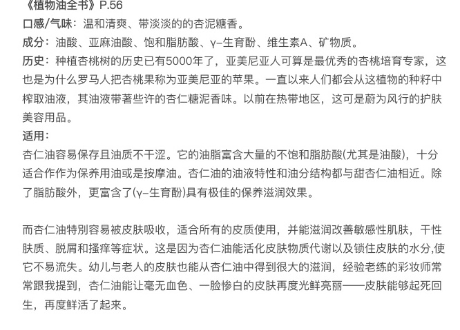 在护肤方面,杏仁油不干不涩,非常轻发盈,很适合作为保养用油或按摩油哦,而且适合所有肤质,它能够滋润和改shan敏感肌,还有干性肤质的脱屑和瘙痒等症状,通过活化代谢锁住水分,使皮肤保持水润。尤其是幼儿和老人,杏仁油也能提供显著的滋润效果,甚至能让暗淡无光的肤色恢复光鲜亮丽。我主要是用来稀释轻盈油,还有安精油和薰衣草精油,全身涂涂,也偶尔用来面部油浴,毕竟,能比玫瑰果油省很多哦!