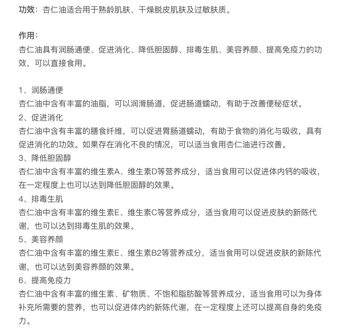 在食用方面,杏仁油更是好处多多!它能够润肠通便,丰富的油脂cu进肠道蠕动,改shan便秘症状。同时,所含的膳食纤维有助于食物消化吸收。此外,杏仁油中的营养成分如维生素A、D等对于降d胆固醇,维生素E、C等,则能cu进新陈代谢,排du生肌、mei容养颜,还能ti高免yi力!用来作为肠道油浴用油,口感也算相对不错了!