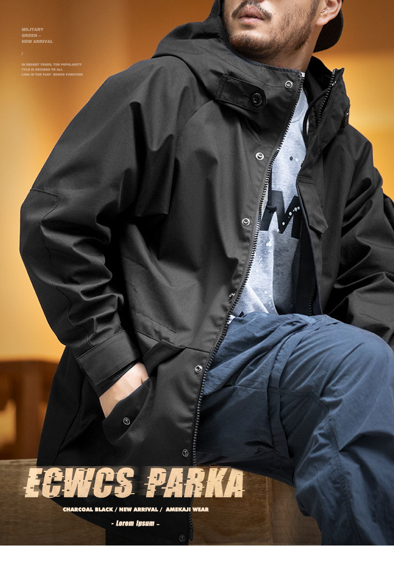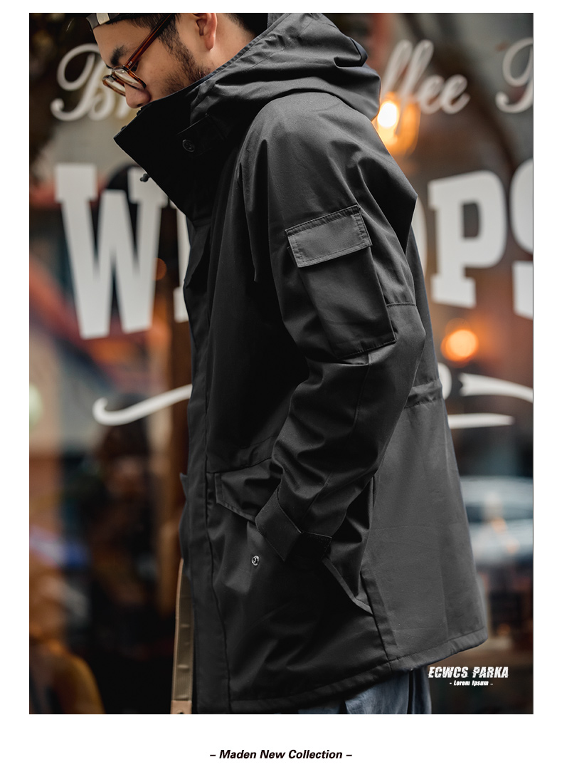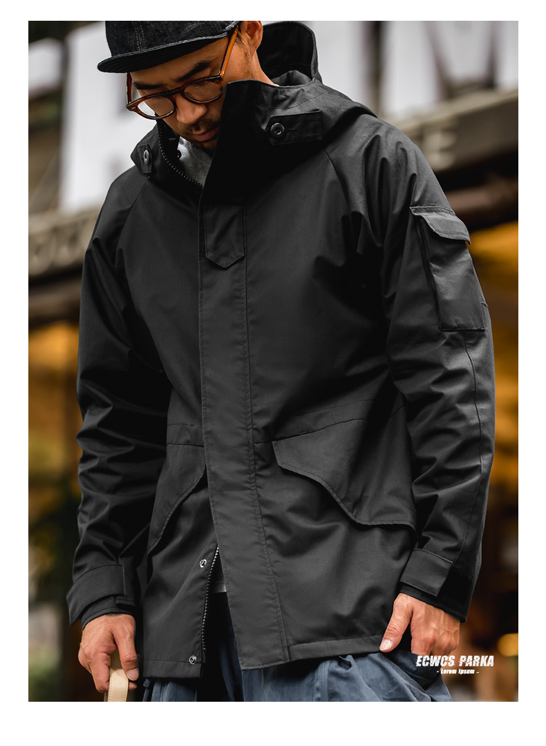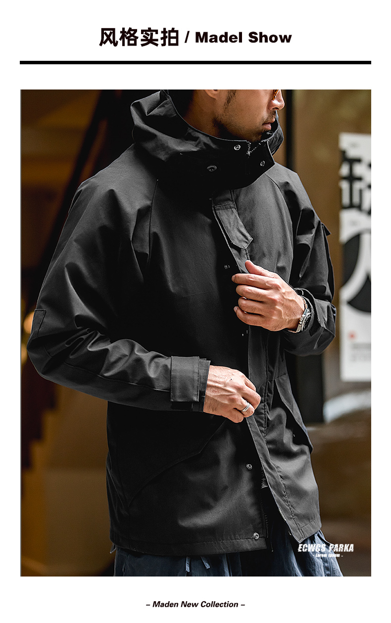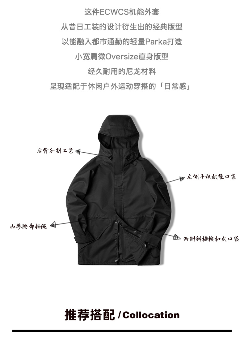 工装精选 美式休闲户外运动连帽机能外套抽绳黑色尼龙夹克风衣男