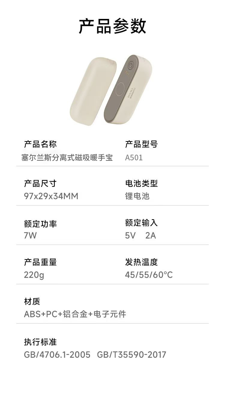 【品名】塞尔兰斯 分离式磁吸暖手宝 6000毫安大容量 长续航 5秒速热3档可调 【规格】绿色、粉色、白色 【产地】国内 【发货包装】独立包装 【发货地】深圳 【发货快递】圆通 【不发货区域】新疆、西藏、港澳台 【补邮费地区】内蒙古、宁夏、甘肃、青海+8元 【发货时效】48-72小时,周末节假日顺延 |