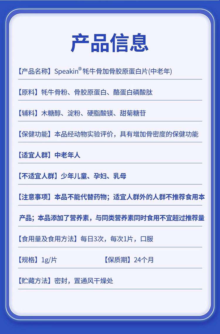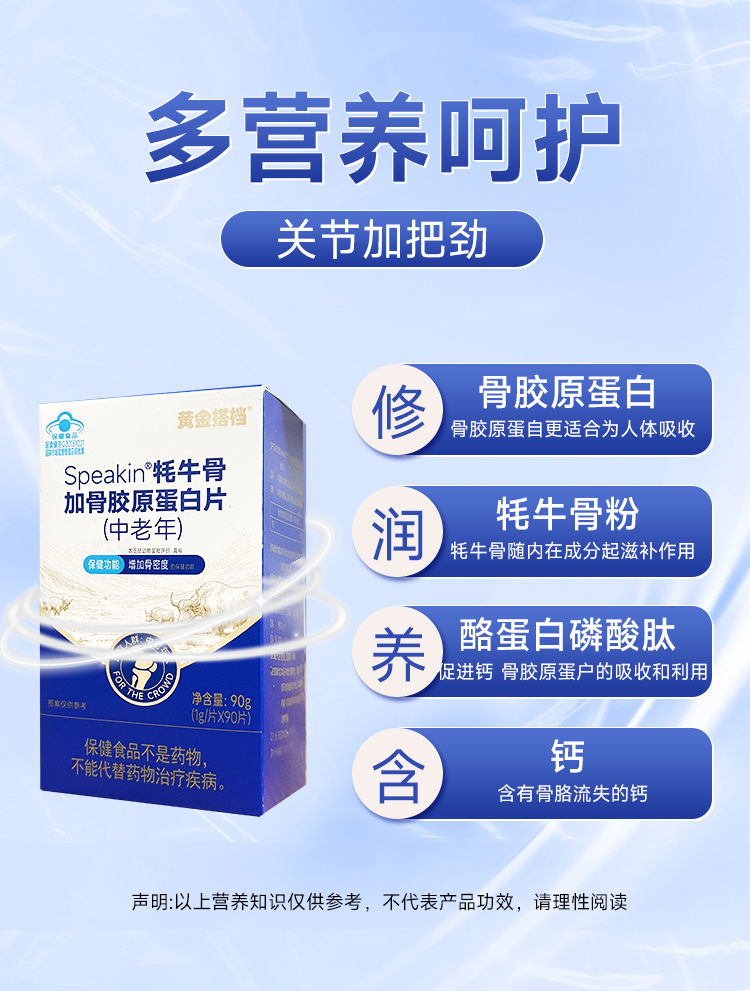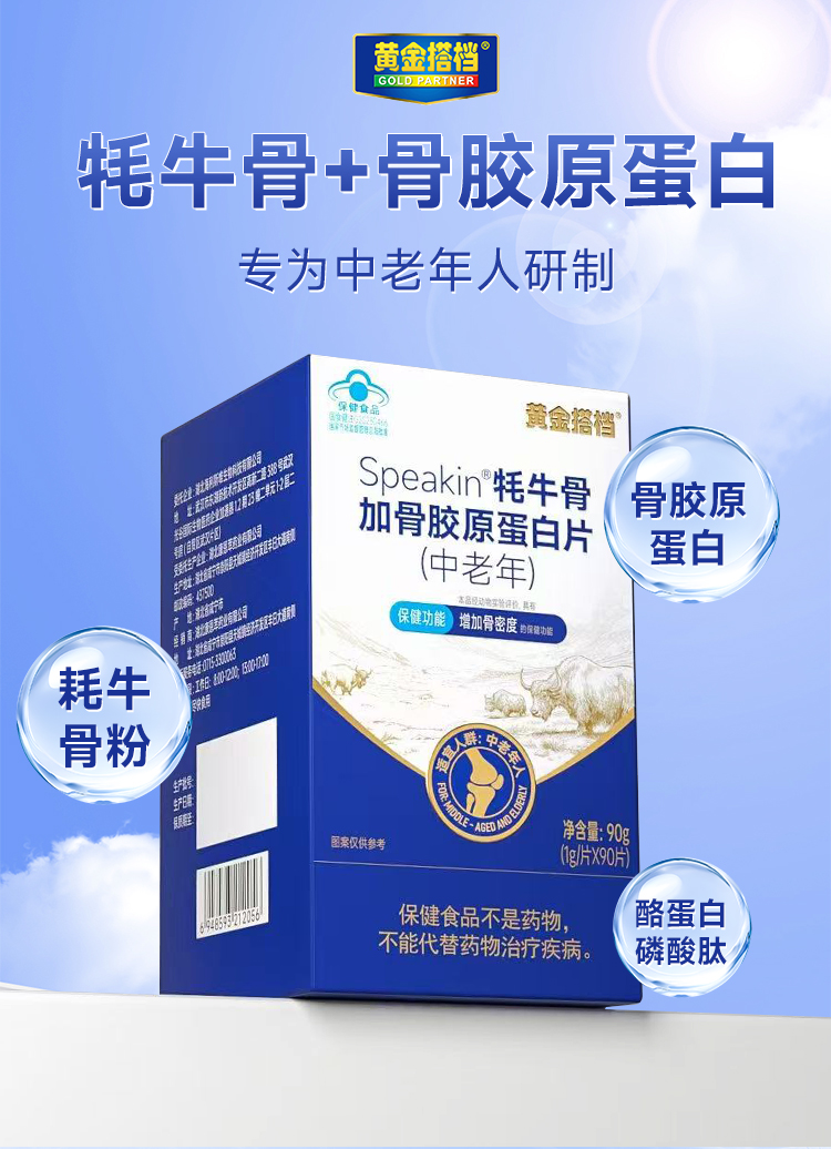 【品名】【拍1发4】黄金搭档Speakin 耗牛骨加骨胶原蛋白片中老年 90g/瓶 【规格】 蛋白片90g*2瓶(赠口乐B泡腾片15g*2支) 【产地】国内 【保质期】24个月 【发货包装】独立包装 【发货地】江苏 【发货快递】圆通 【补邮费地区】新疆、西藏+10.5元/单 内蒙古、宁夏、甘肃、青海+7元/单 【发货时效】48-72小时,周末节假日顺延 |