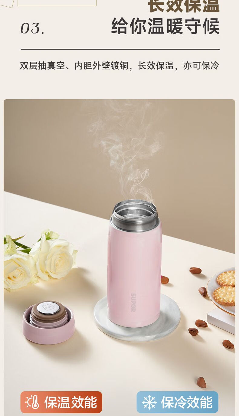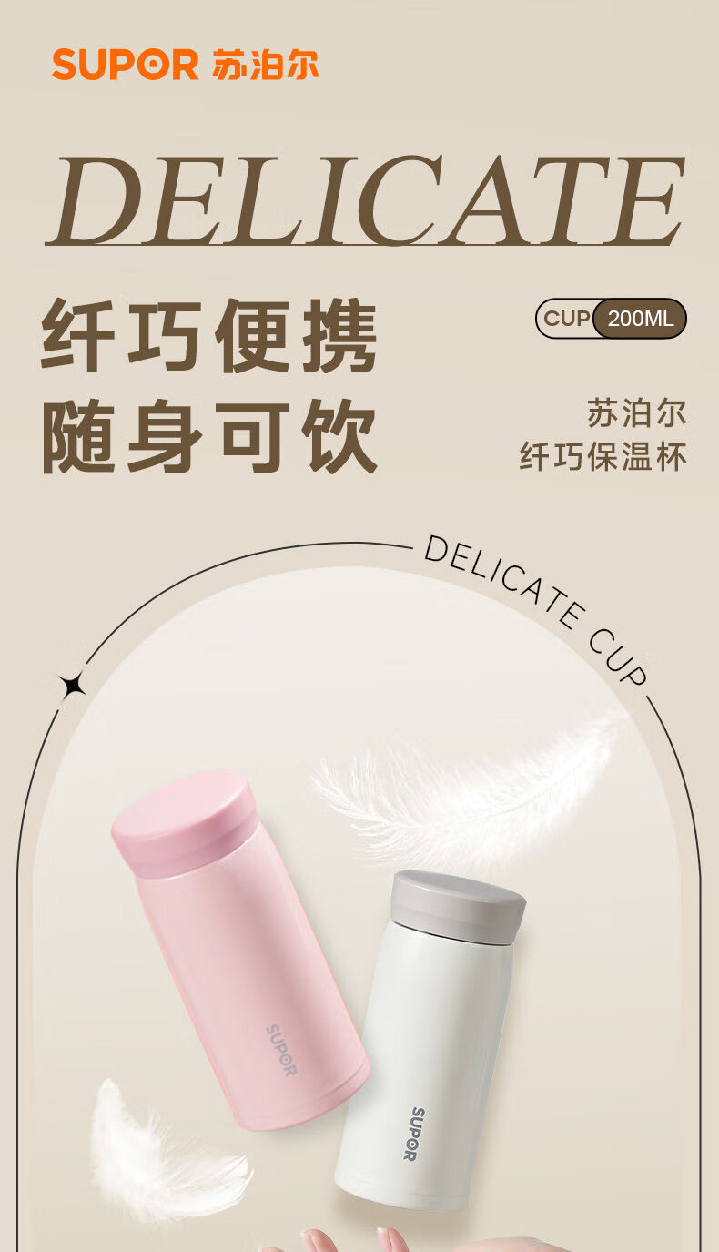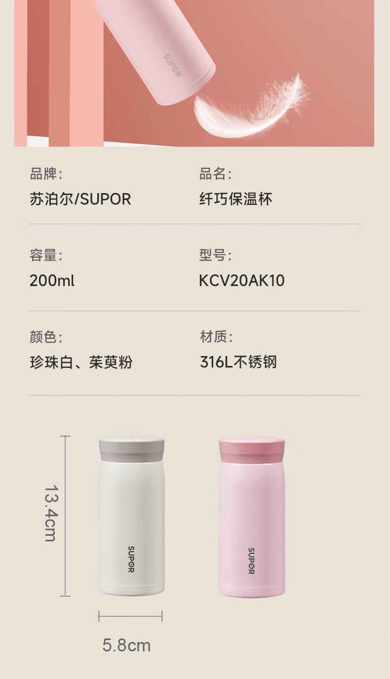 SUPOR 苏泊尔保温杯316不锈钢男女士水杯儿童杯子200ml迷你便携KCV20AK10白/粉