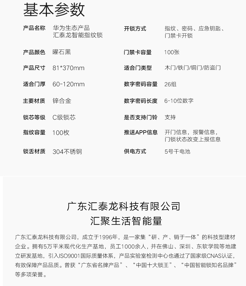 Huawei华为生态汇泰龙指纹锁家用防盗门电子密码智能锁手机远程A1