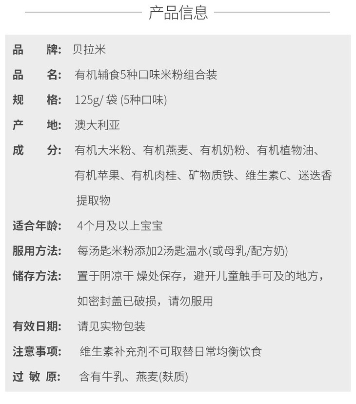 现货 贝拉米有机婴儿高铁米粉米糊125g 4+5+6+