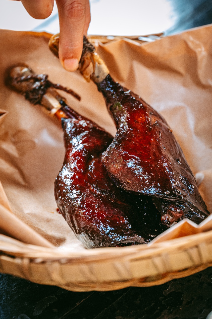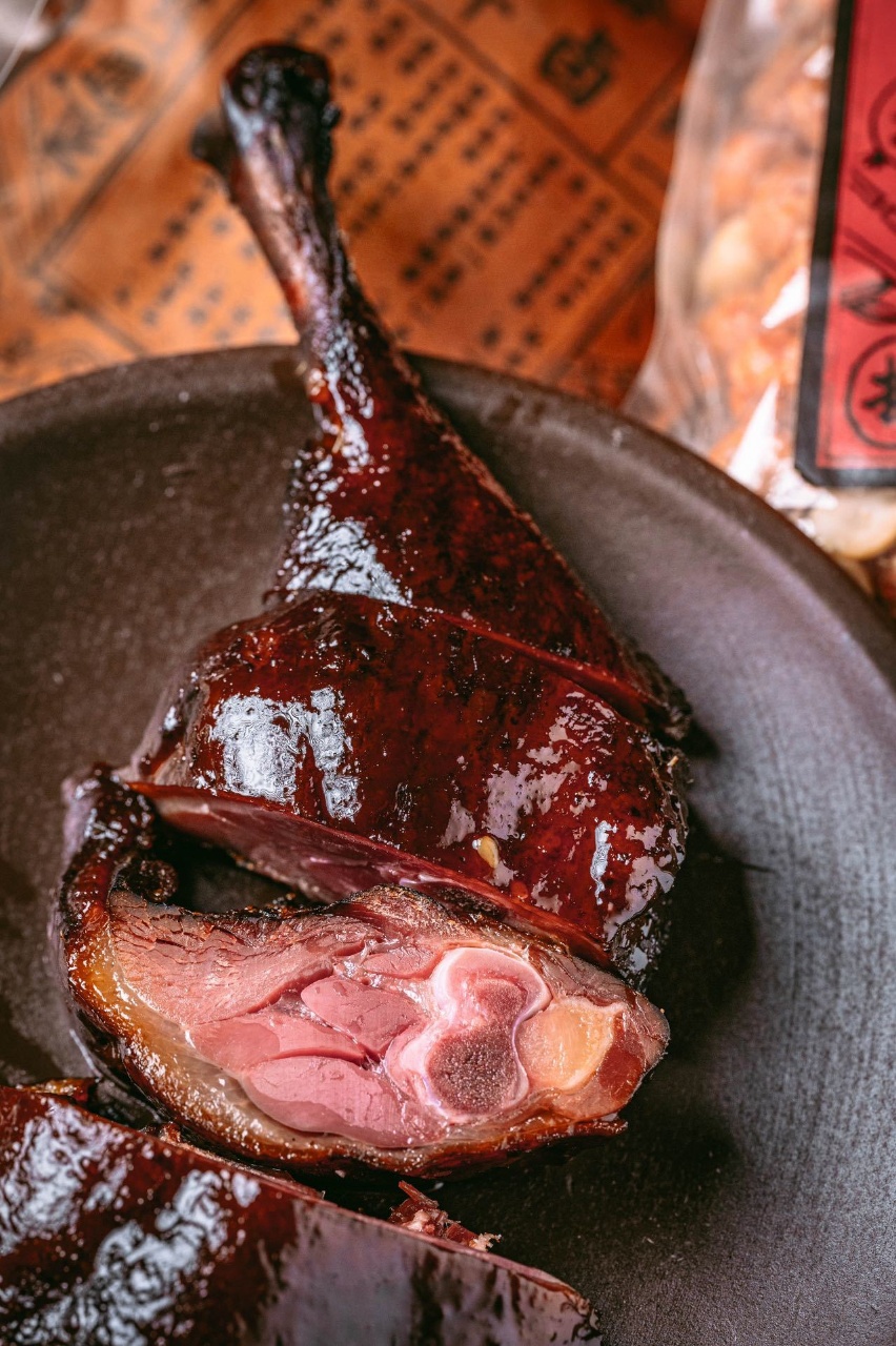 留海棠酱鸭腿红到发亮,表面闪着油光。