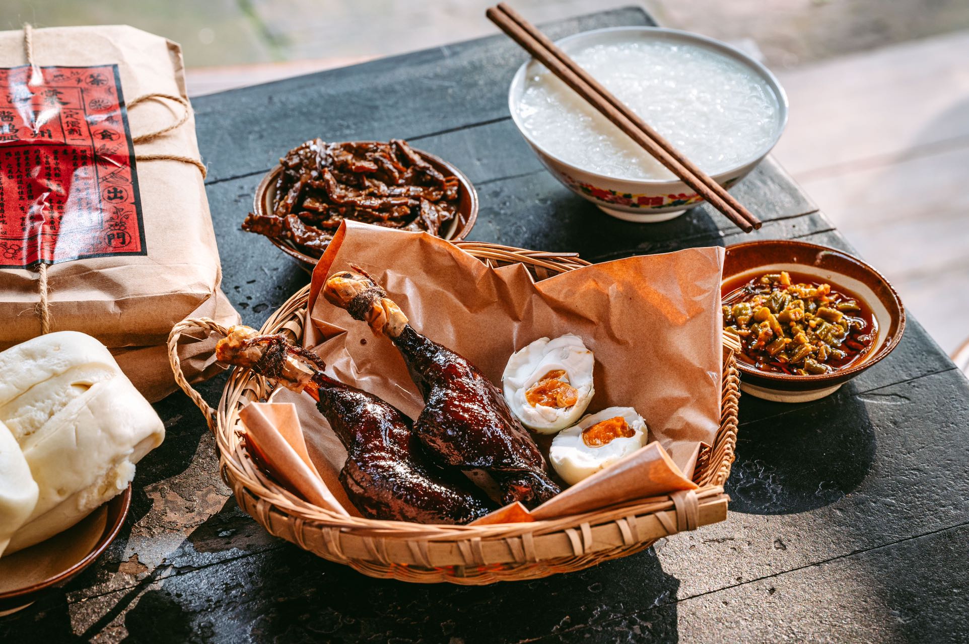 “蒲叶扇,酱鸭腿配稀饭,馒头和盐蛋”