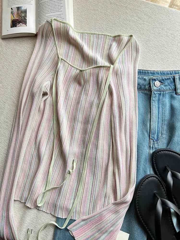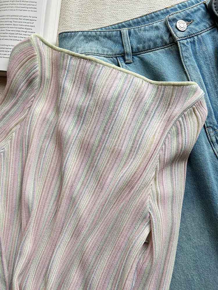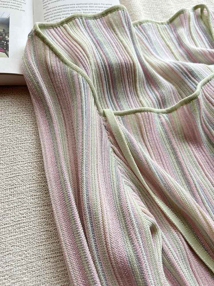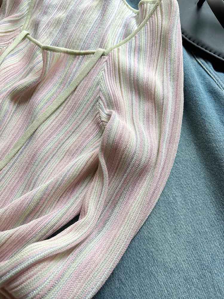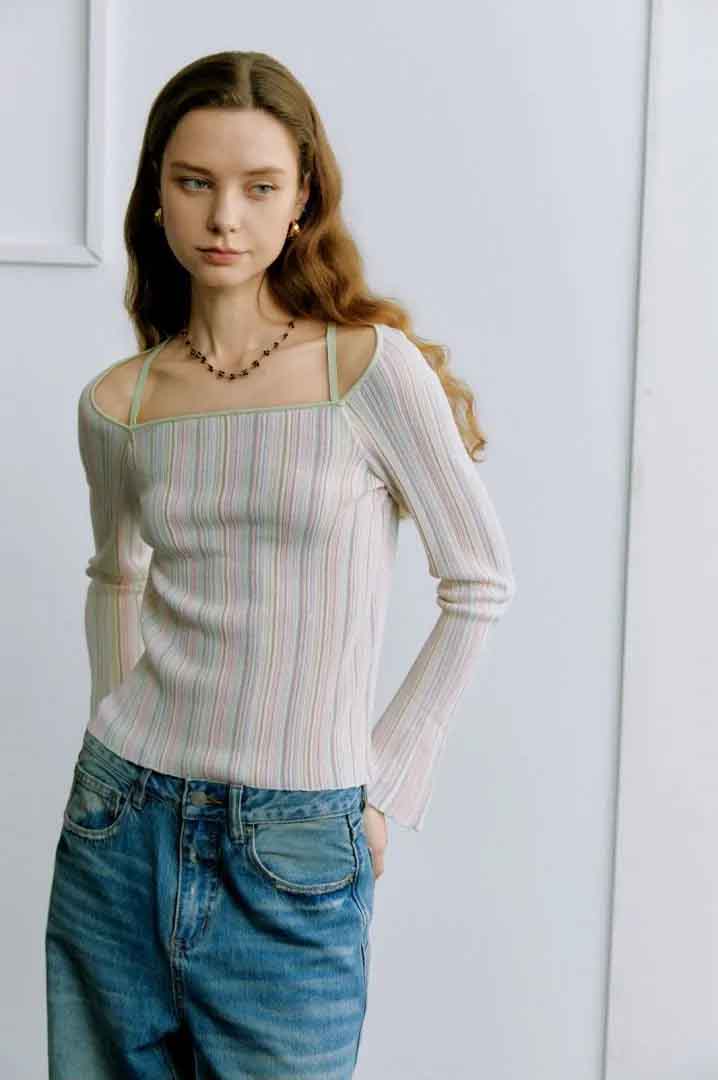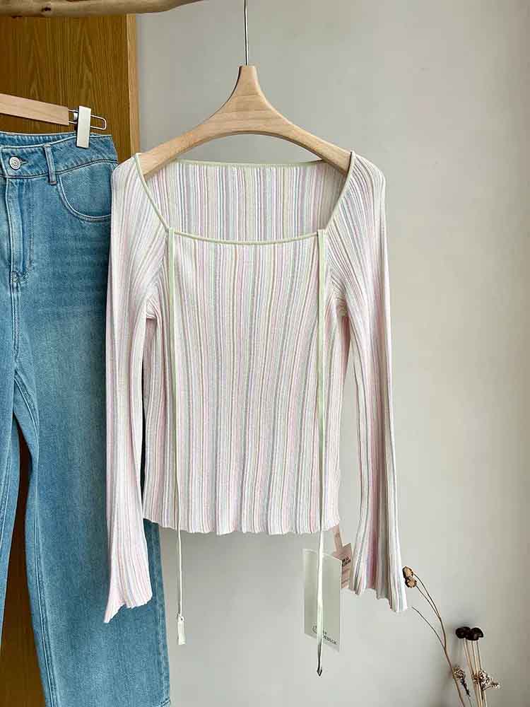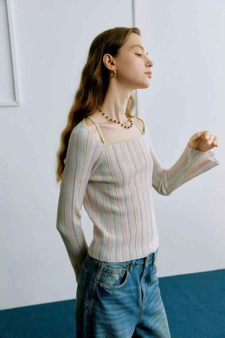 「再生纤维素纤维方领条纹上衣」多巴胺色,活力满满