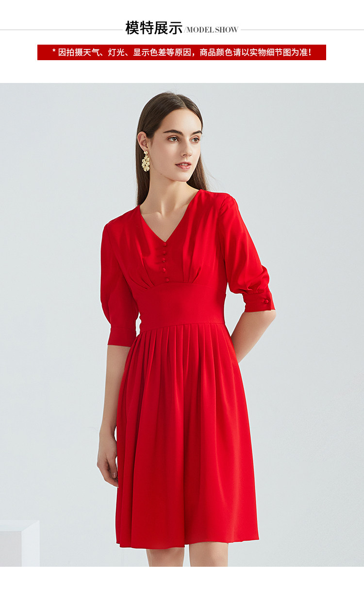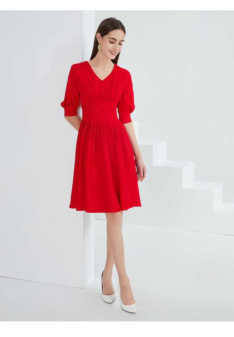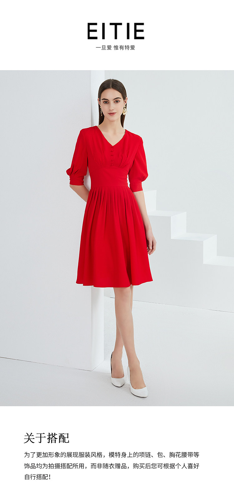 EITIE爱特爱春季新款复古气质洋气V领收腰泡泡袖显瘦连衣裙女A2107711