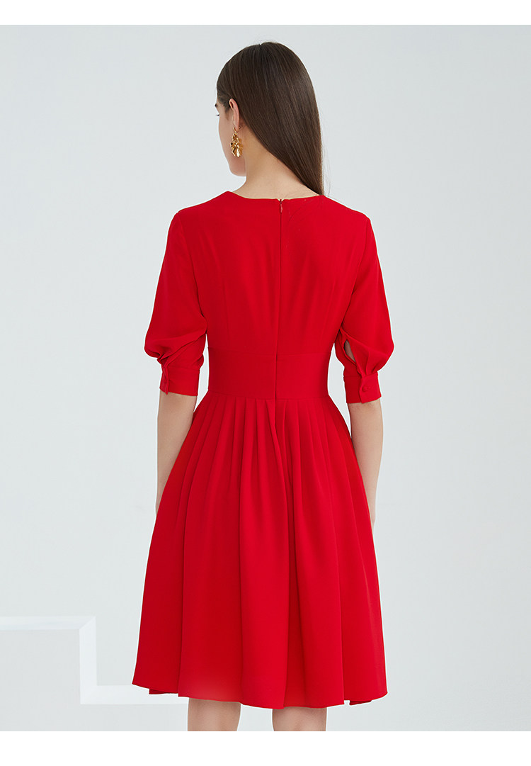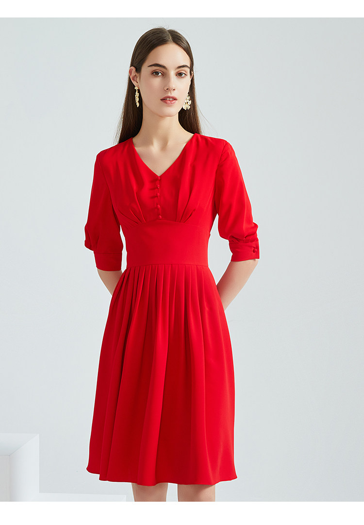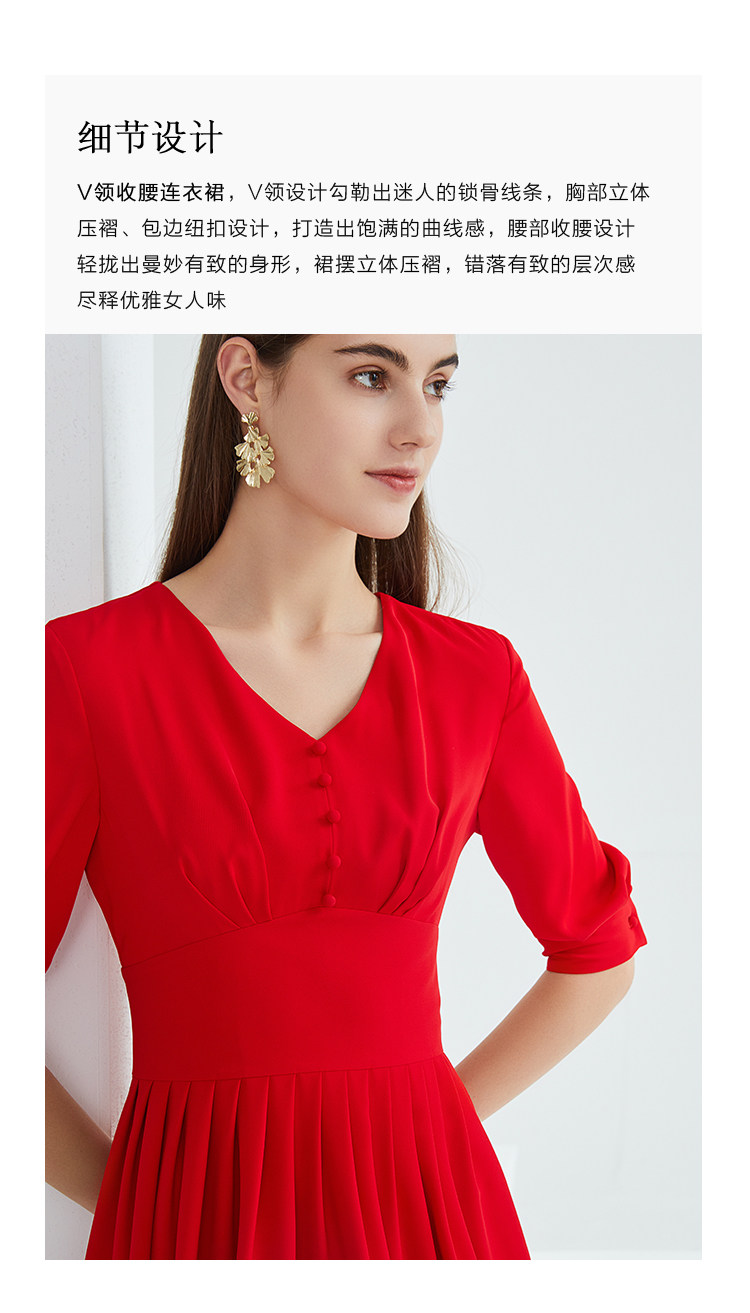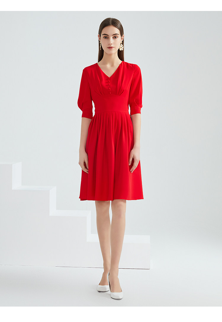 EITIE爱特爱春季新款复古气质洋气V领收腰泡泡袖显瘦连衣裙女A2107711