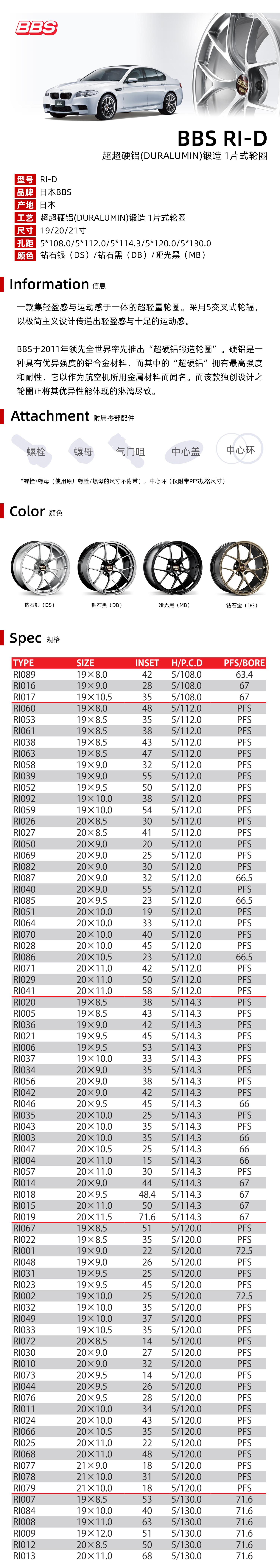 BBS RI-D型号 一片式超硬铝(DURALUMIN)锻造轮圈 19/20/21寸 5*108/112/114.3/120/130