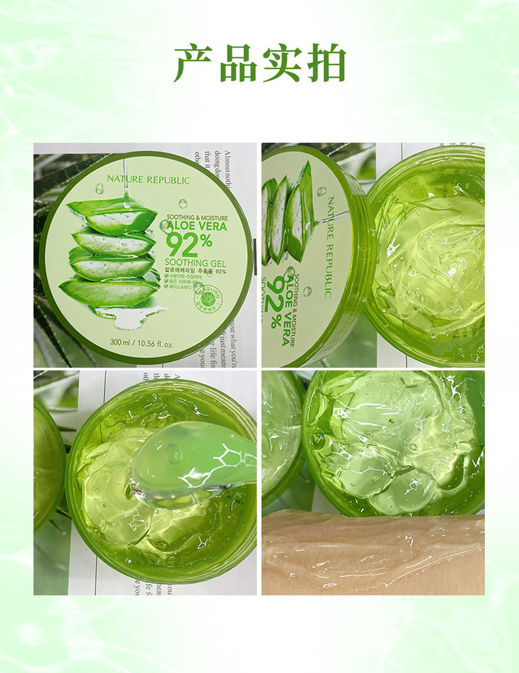 韓國Nature Republic自然樂園蘆薈膠---萬能的蘆薈膠300ml自然樂園系列產品具有持久水潤💦💦、清爽淨透,👸🏻👸🏻補水、祛印、修復的作用,自然樂園蘆薈膠富含92%的蘆薈精華🍎🍐,是普通面霜含水量的6 倍🌷,也就是說你買的這一大罐蘆薈膠相當於買整顆蘆薈了,補水保濕效果超贊!👍🏻👍🏻蘆薈膠顏色無色透明的💦💦,啫喱質地像果凍一樣Q💓💓,功效有淡斑祛痘、鎮靜止癢、補水保濕、深層滋潤 、曬後修復、增強彈性……😏😏